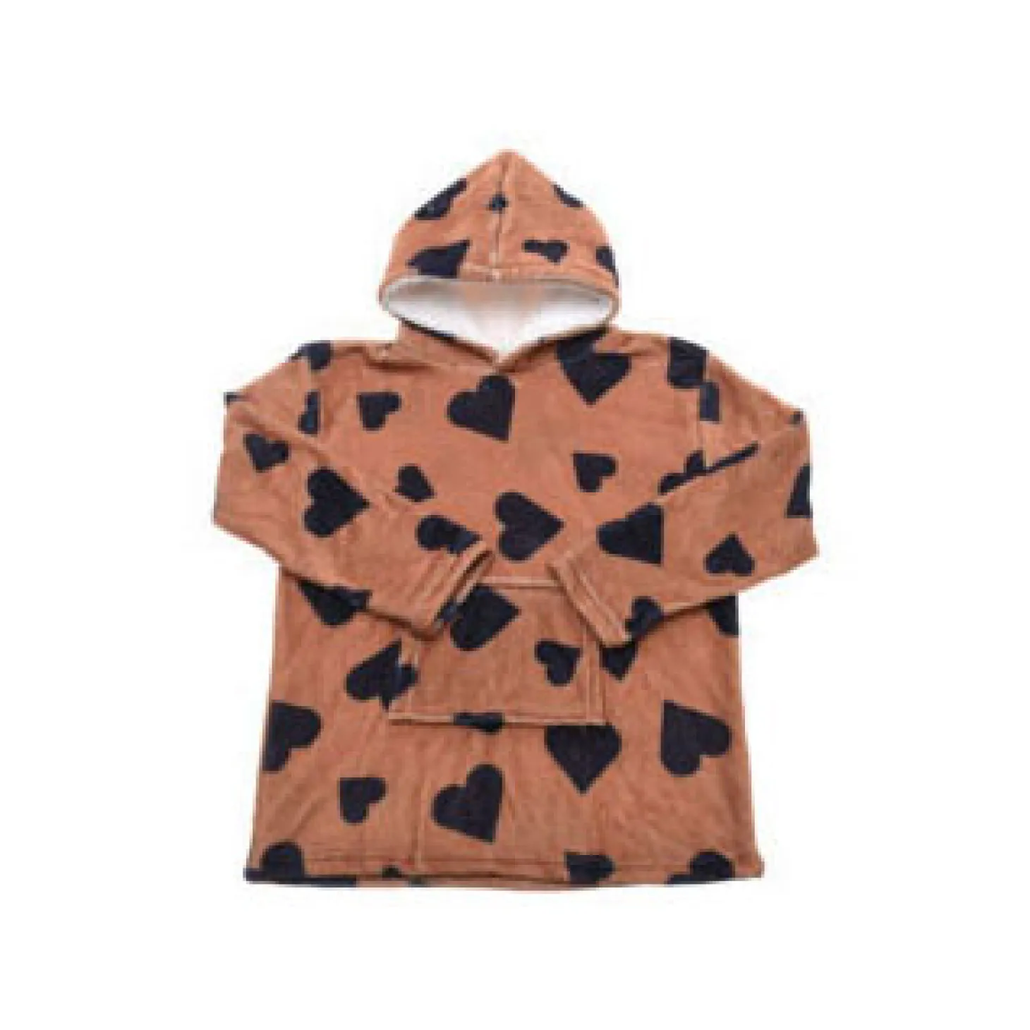 Deze heerlijke knuffeltrui voor kinderen is zooo zacht! De knuffelige binnenkant houdt kinderen lekker warm op koude winterdagen. De trui heeft een capuchon en een zak op de buik, waar ze lekker hun handen in kunnen verstoppen. Een fijne trui om in weg te kruipen! Deze hoodie is bruin met een patroon van grote, zwarte harten. Eén maat.