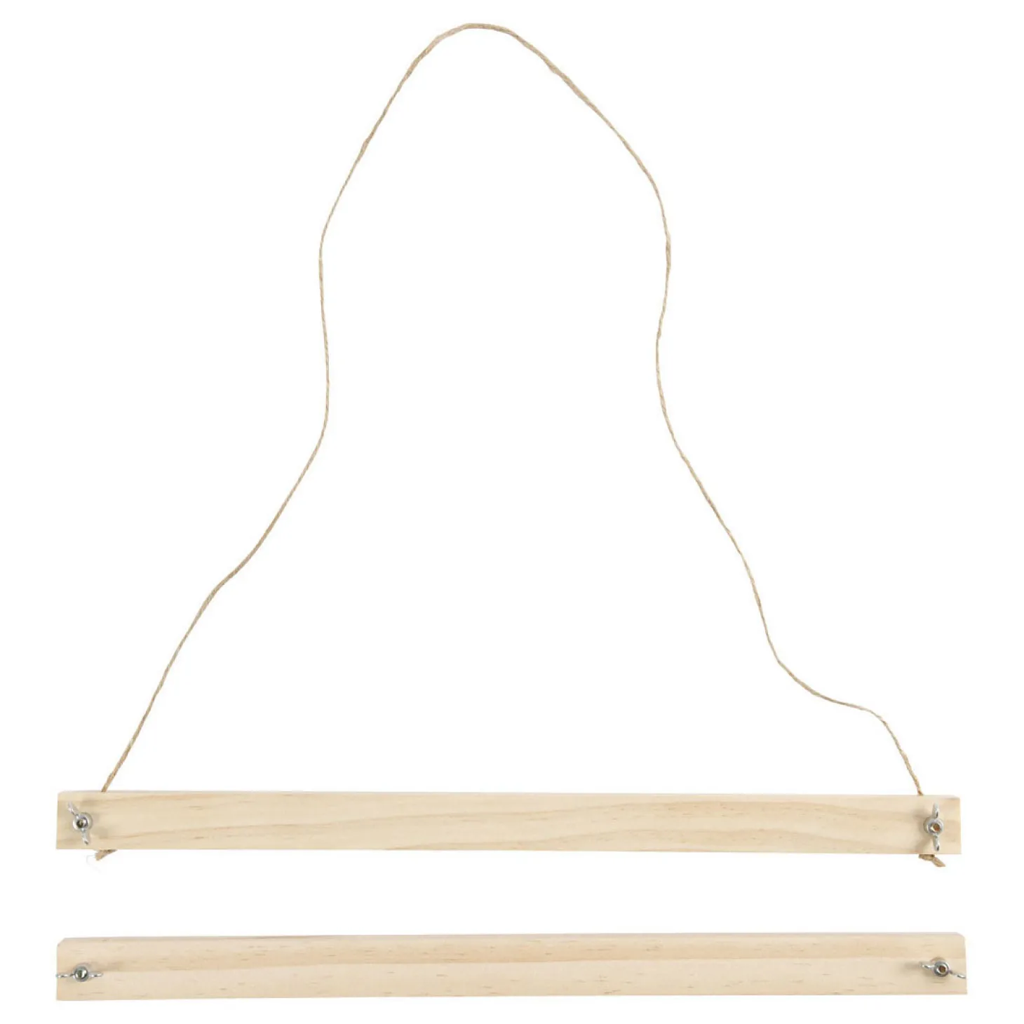Set posterlijsten van licht hout bestaande uit 2 boven- en 2 onderlijsten, waarbij de ophanging wordt gefixeerd door middel van een vleugelmoer. Geleverd met apart ophangkoord, dat met een knoop aan de onderzijde van de bovenste strips is bevestigd