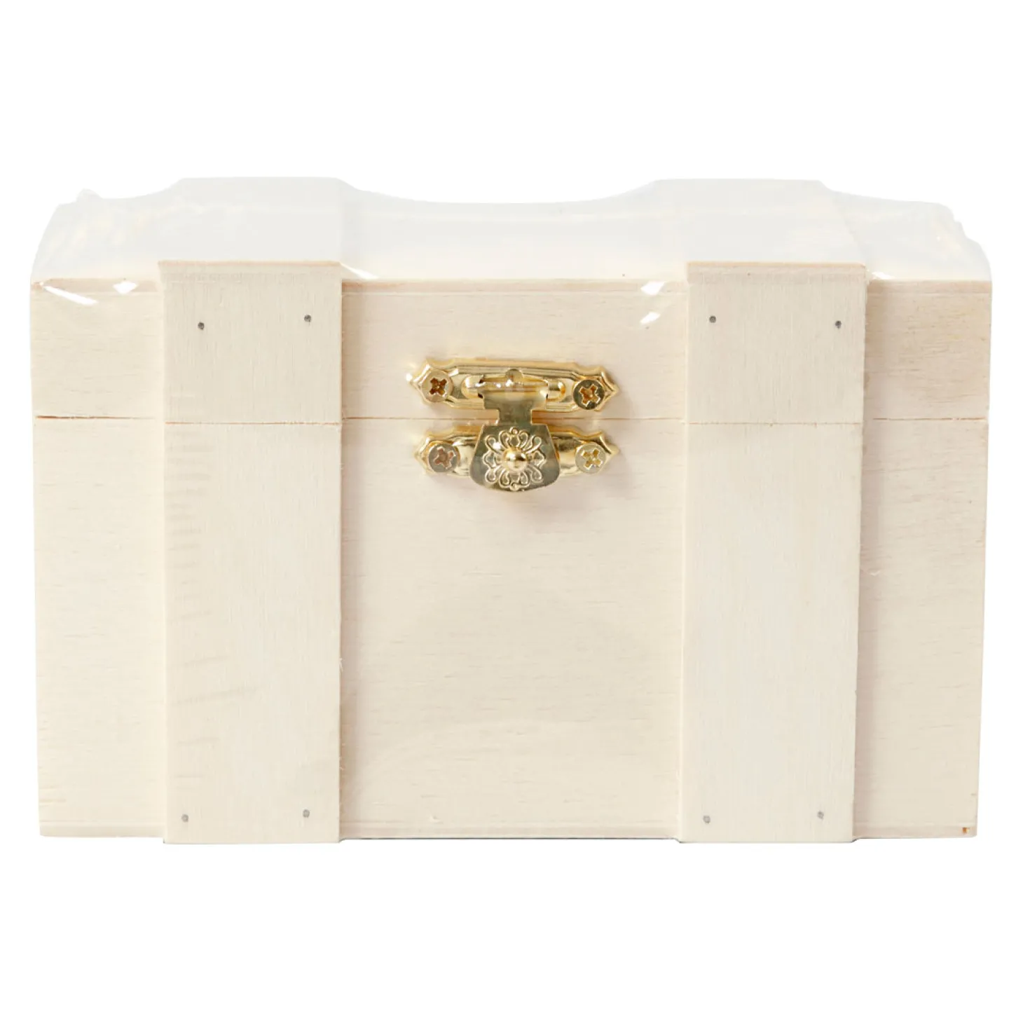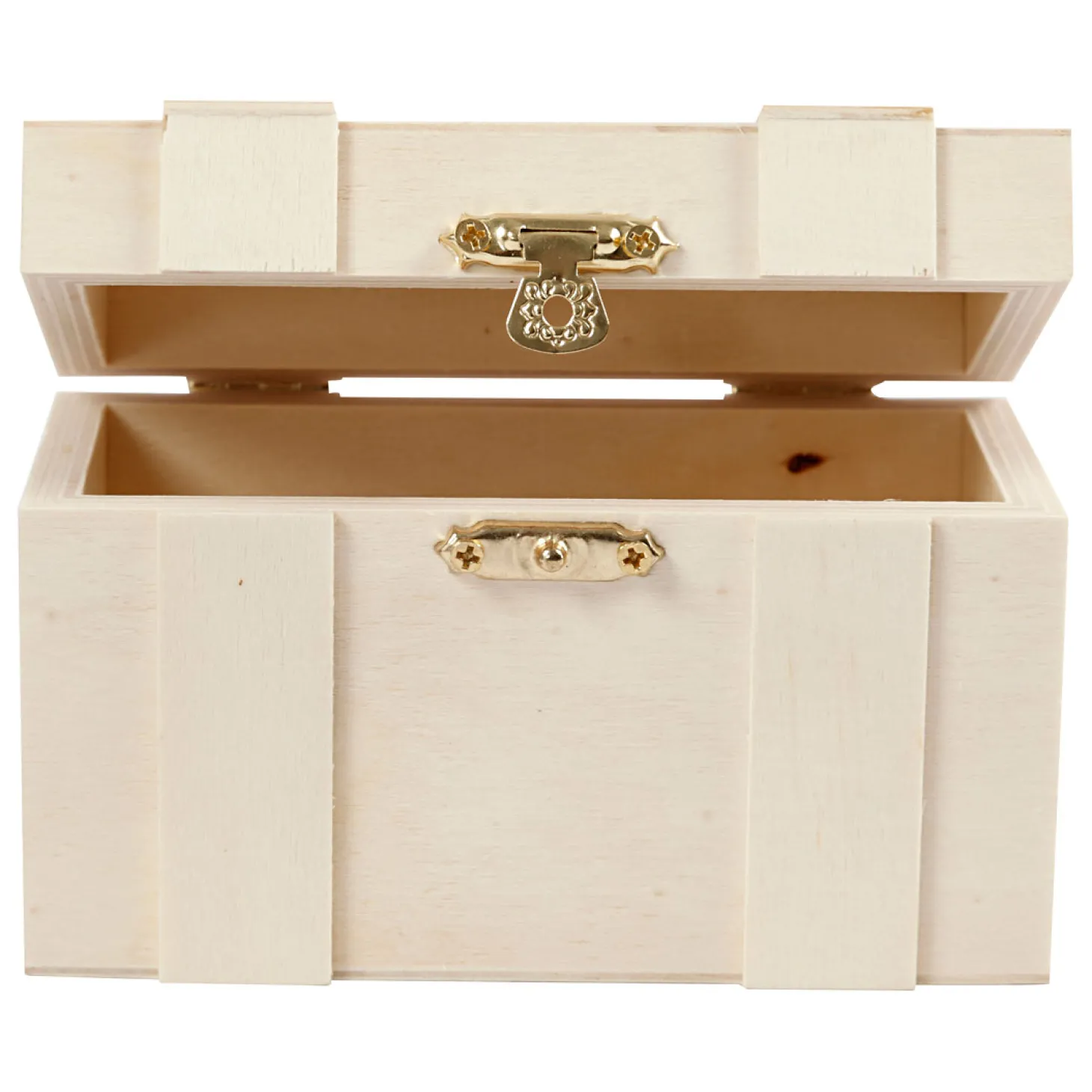 Schatkist van licht hout met metalen sluiting.Eenvoudig te decoreren met Plus Color acrylverf, houtbranden, stempels enzovoort.