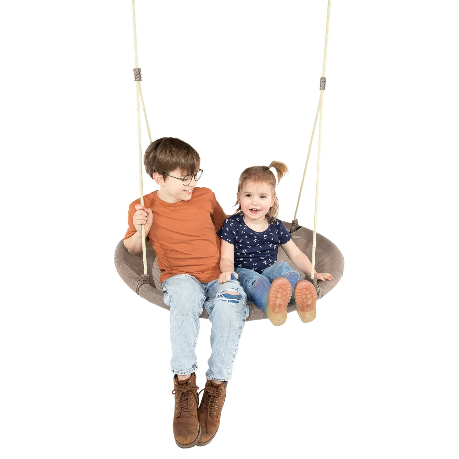 Hier kan je mee thuiskomen! De nieuwe ronde nestschommel met een diameter van 110 cm biedt niet alleen comfortabel schommelplezier, maar is ook echte blikvanger. Het gemêleerde nestoppervlak en de prachtige grijstint genaamd “Sand” aan de rand passen in elk trendbewust tuinontwerp.