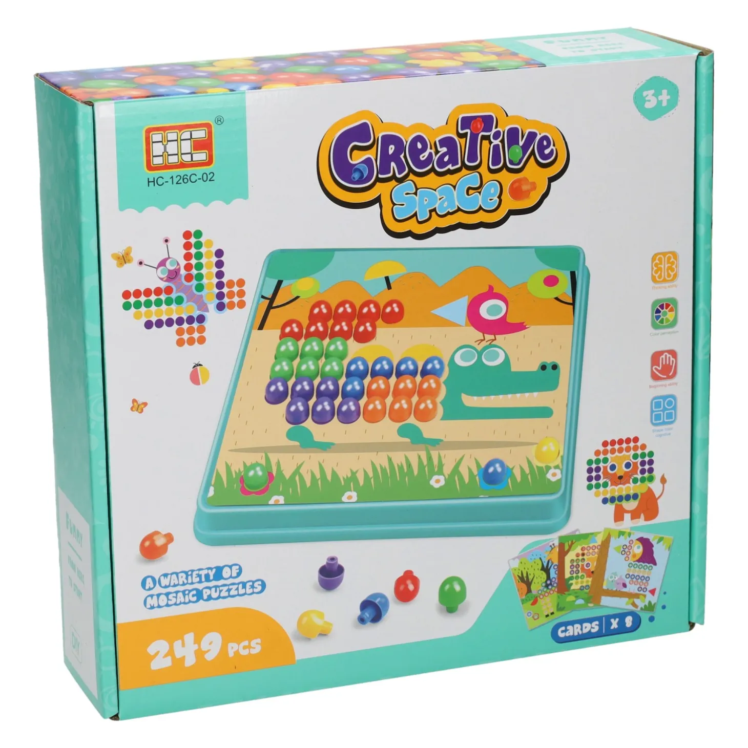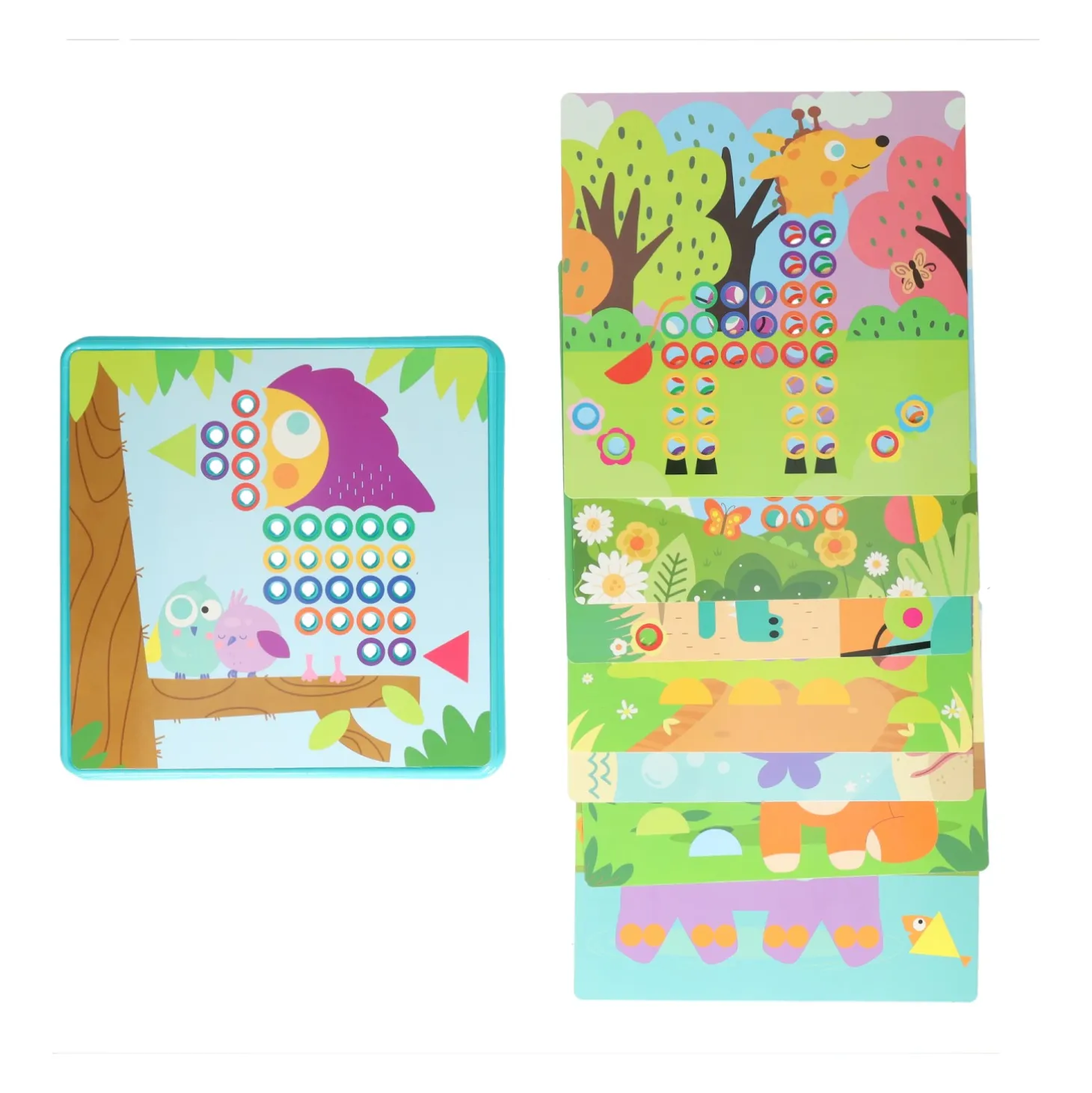 De set bevat 8 kaarten en 249 gekleurde buttons en is geschikt voor kinderen vanaf 3 jaar. Het helpt bij het herkennen van dieren en kleuren en stimuleert de ontwikkeling van de fijne motoriek.