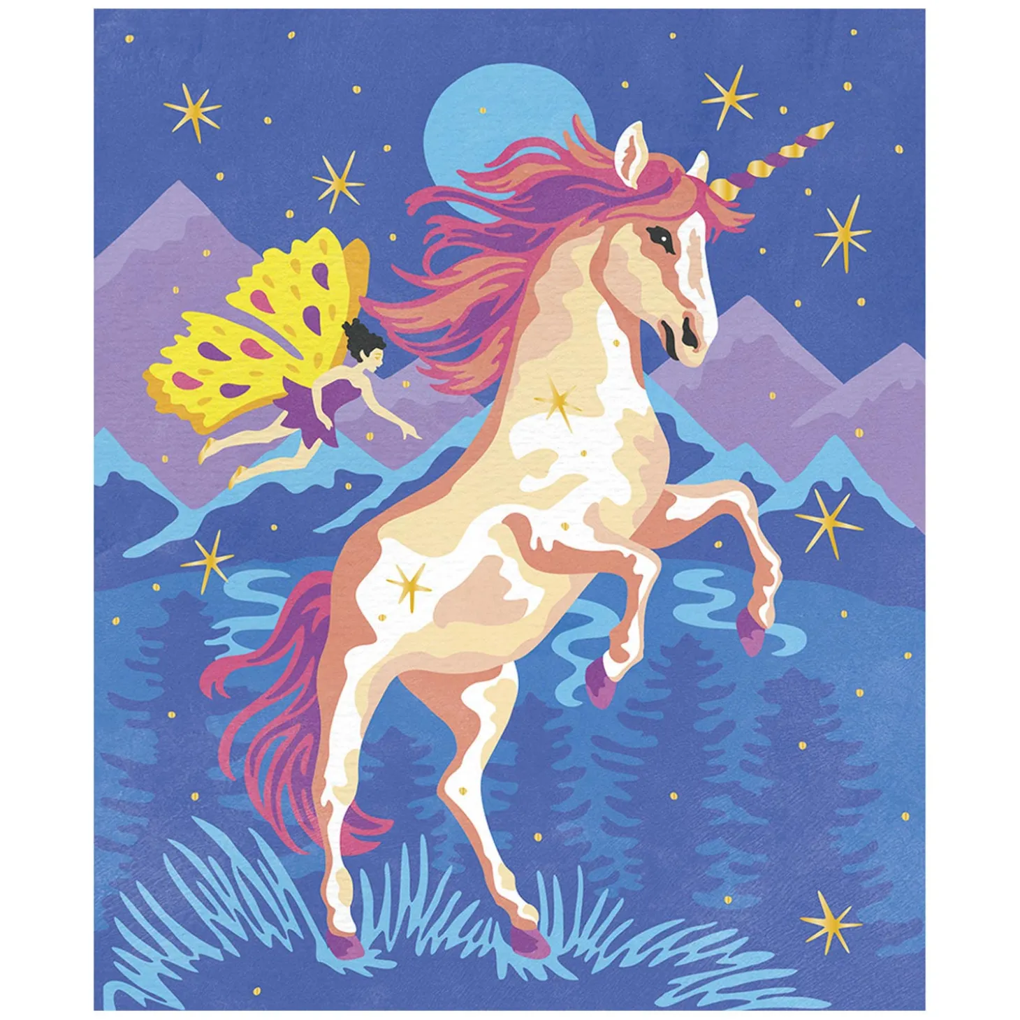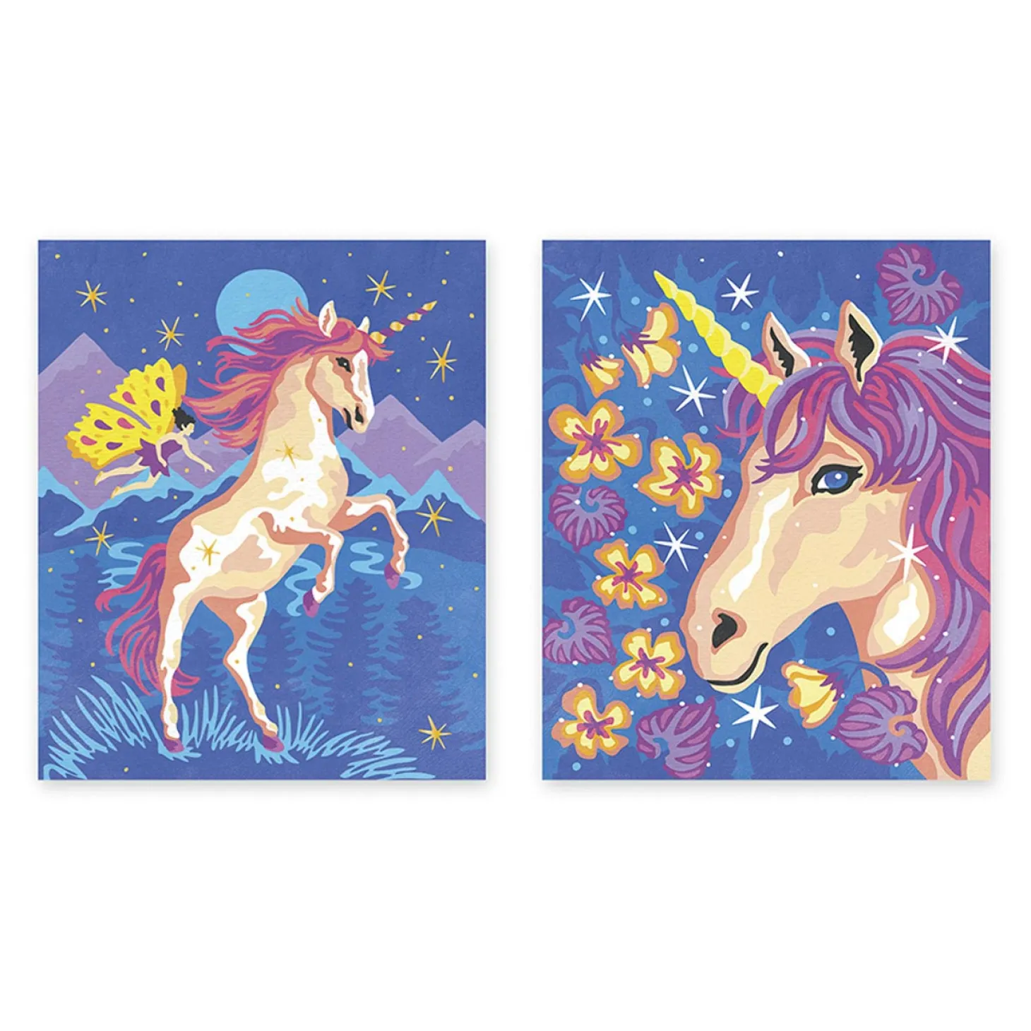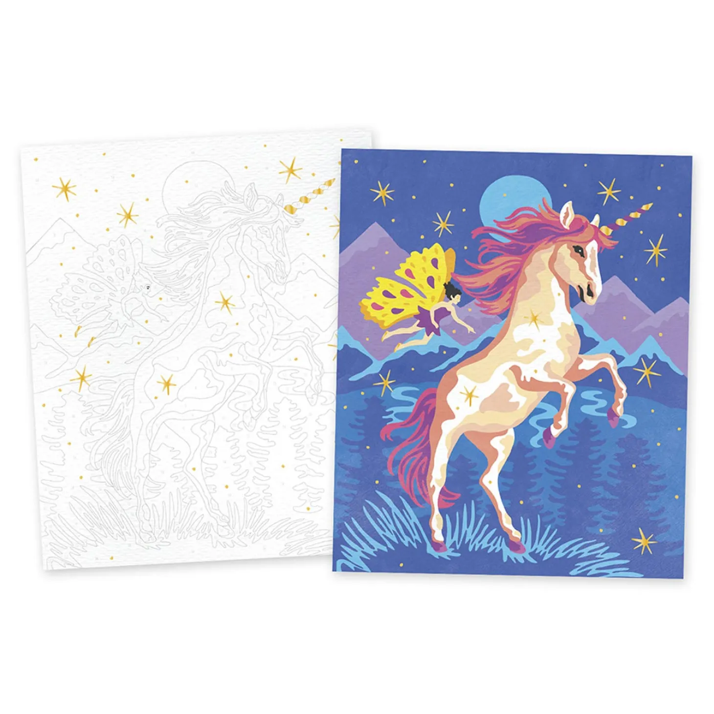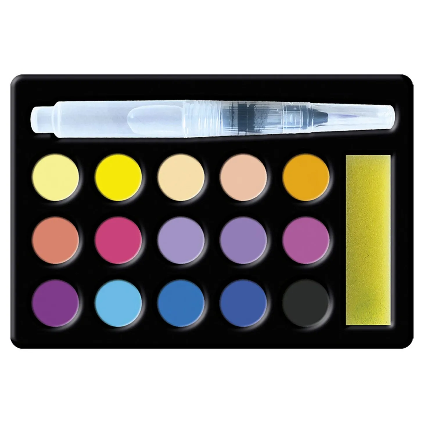 Met 15 potjes aquarelverf en een brushpen met waterreservoir is het schilderen van magische eenhoorns kinderspel! Een van de schilderijen heeft zelfs prachtige vergulde details, voor een echt betoverend resultaat.