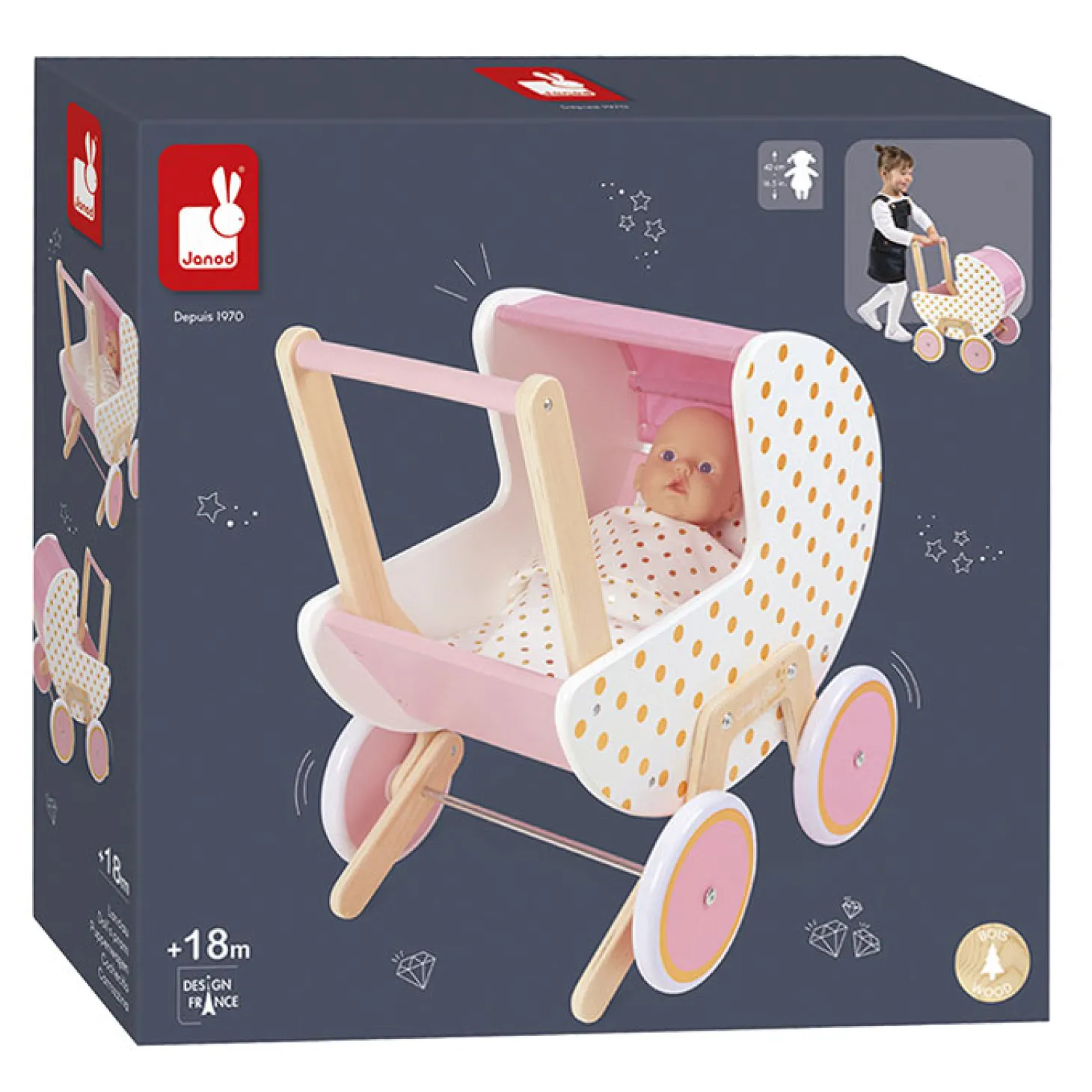 Met geruisloze rubber wielen die geen sporen achterlaten. Voor een optimale veiligheid is de kinderwagen “Candy Chic” voorzien van een anti-kantelsysteem dat kan worden afgehaald zodra uw kind zich meer op haar gemak voelt tijdens het lopen. De poppenwagen wordt geleverd met een mooi deken en een hoofdkussen met goudkleurige stippen, zodat de knuffels en poppen lekker comfortabel zitten. De wielassen zijn van metaal voor meer stevigheid en de kap is van stof.