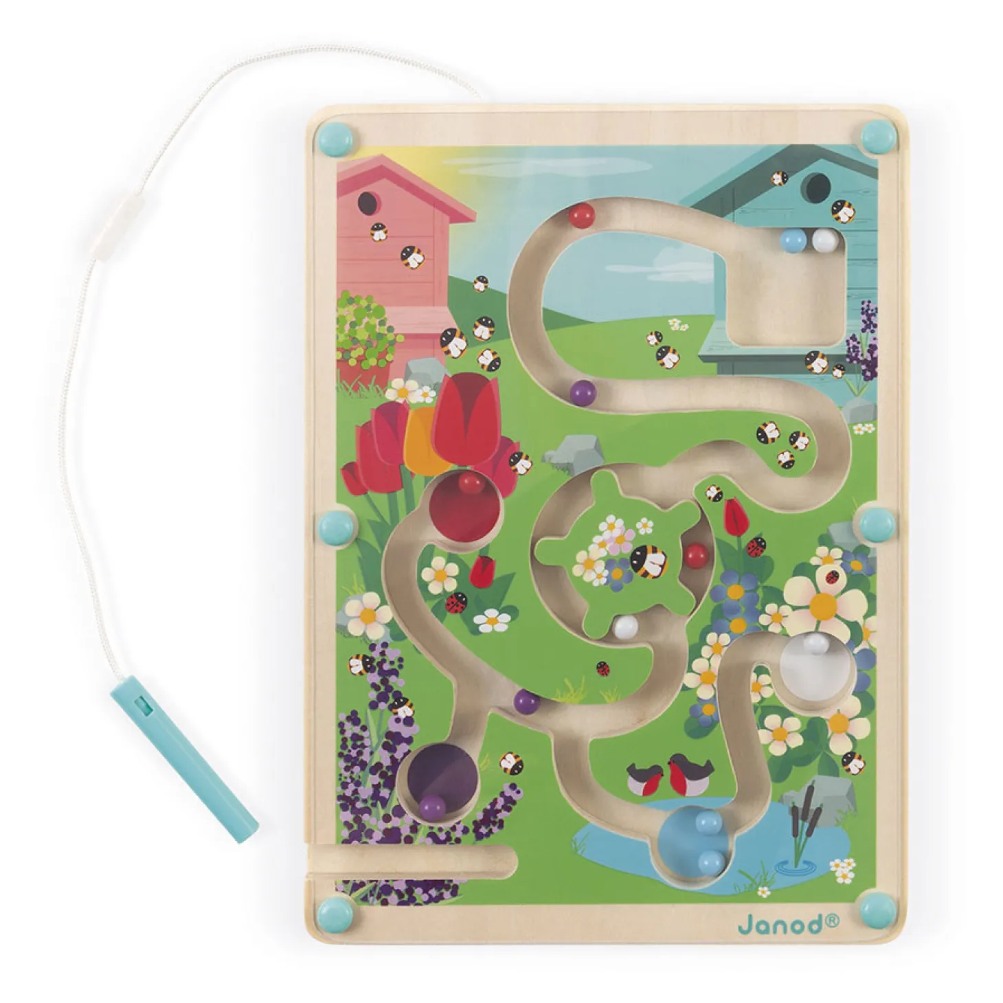 Ga vanaf de bijenkorf door het doolhof en breng de 12 gekleurde knikkers naar hun overeenkomstige zone met behulp van de magneetpen: blauw voor de plas, rood voor de tulpen, etc. Neem het draaihek echter goed zodat je niet vast komt te zitten! FSC-gecertificeerd. 2-5 jaar.