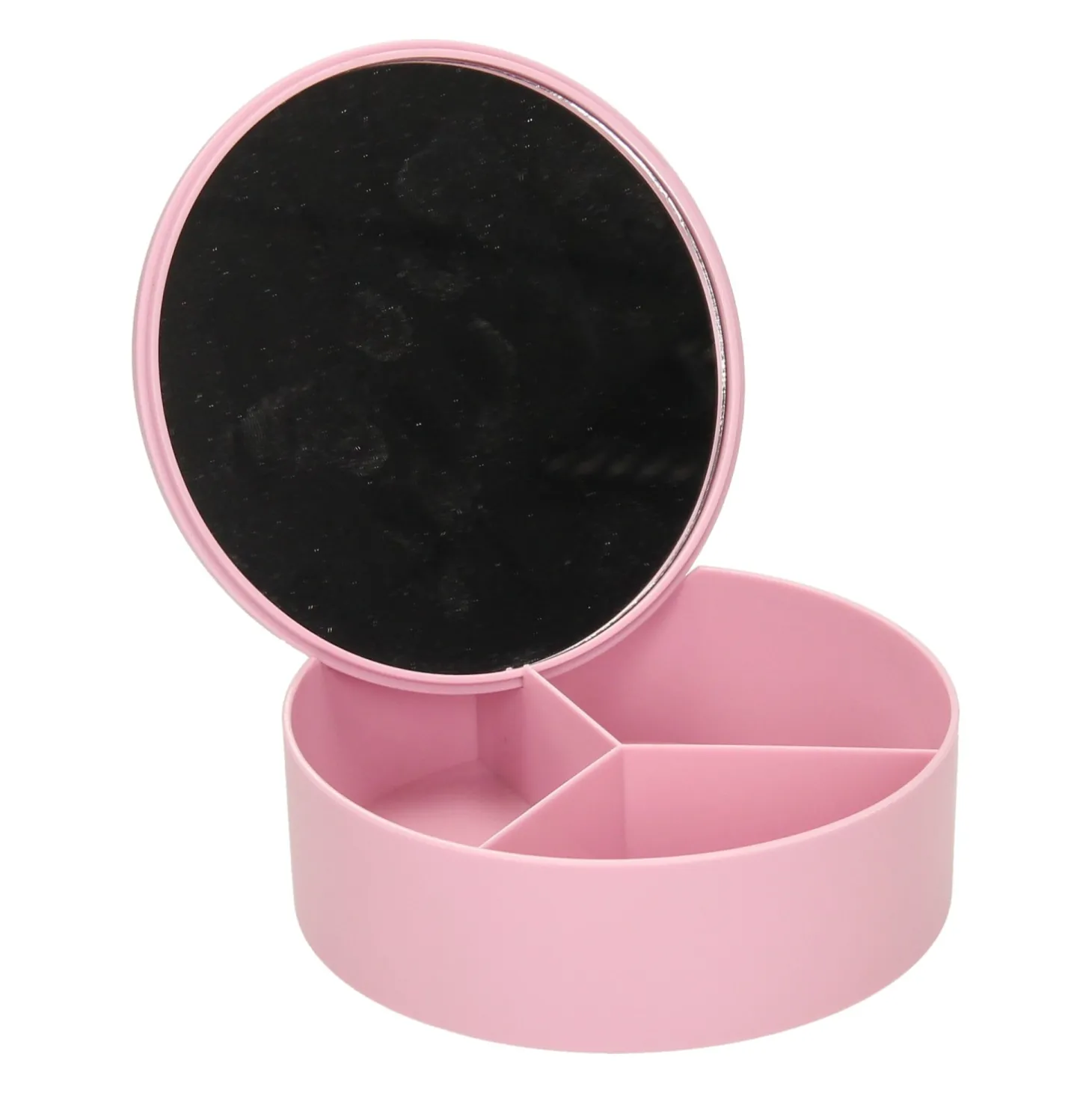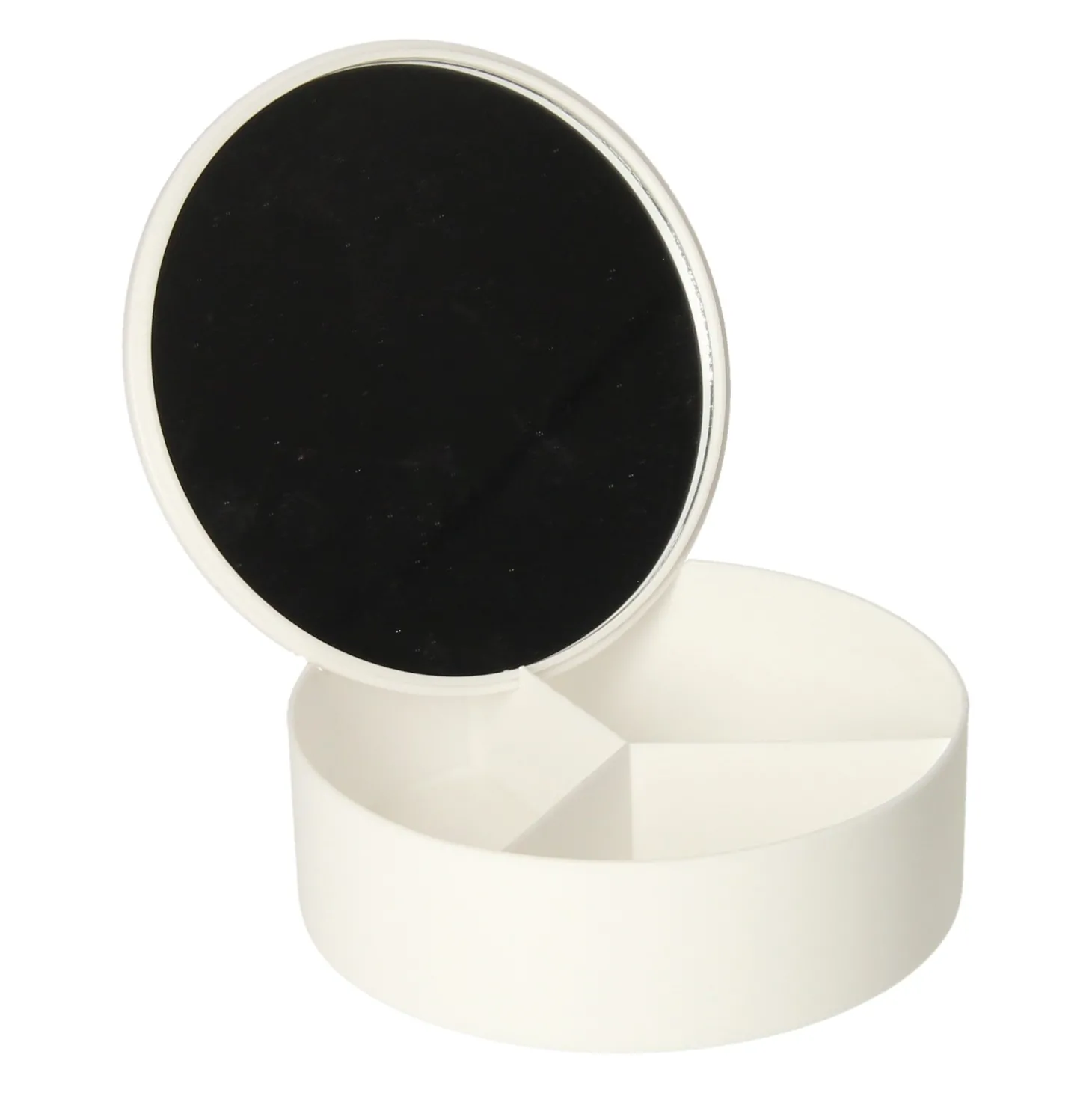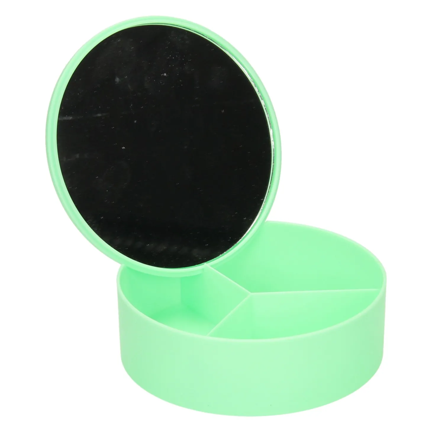 Klein kunststof opbergdoosje met 3 vakken en een spiegeltje (glas) in de deksel. Geschikt voor bijvoorbeeld kleine sieraden of make-up. Wordt geleverd in groen, blauw, roze of wit. Afmetingen: ca. 14 x 5 centimeter.Prijs per stuk, verschillende uitvoeringen/kleuren worden door elkaar geleverd.