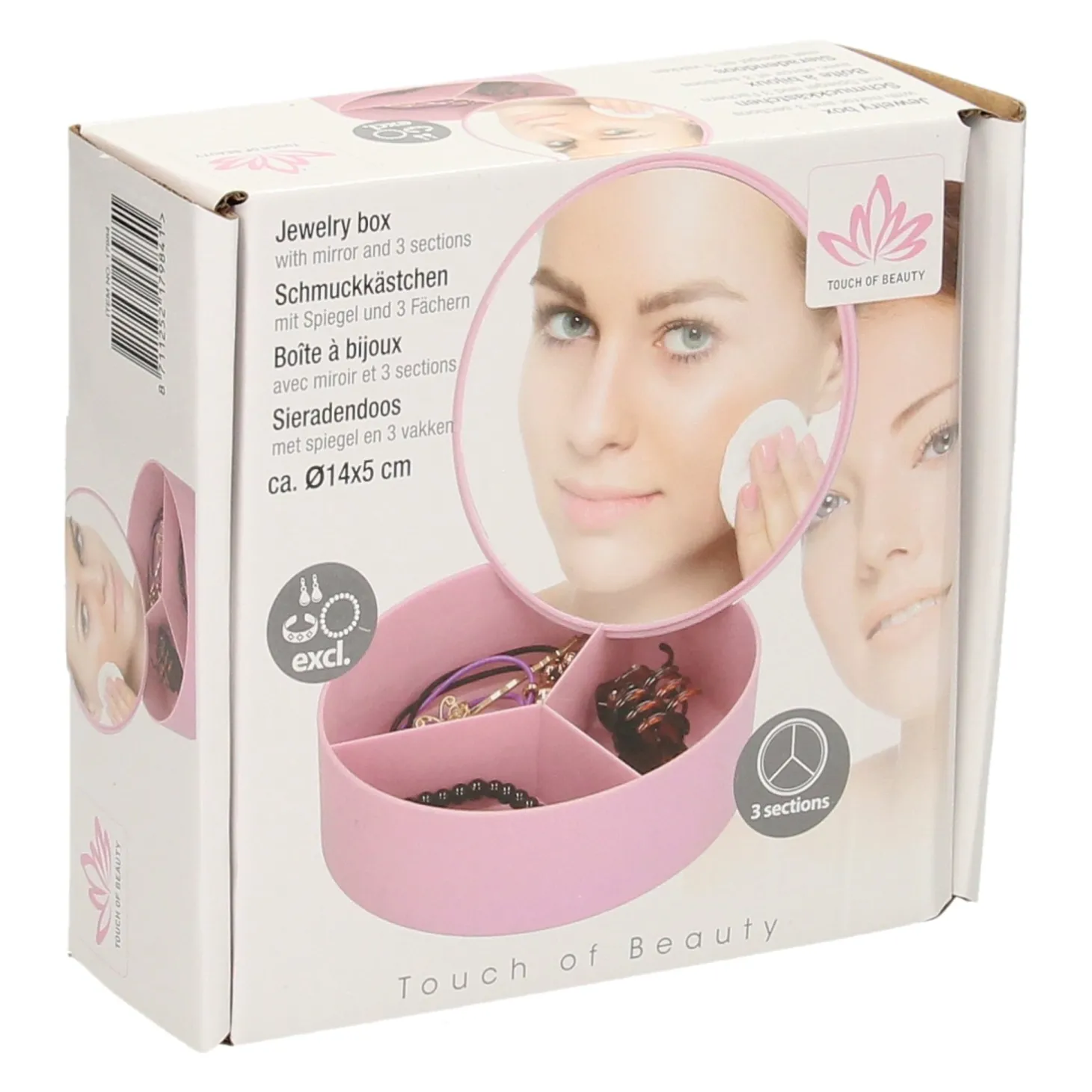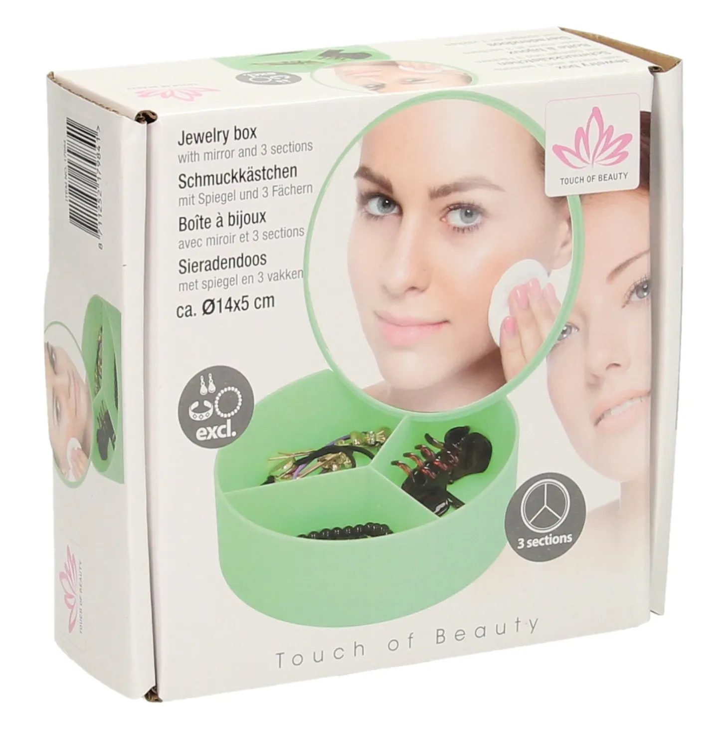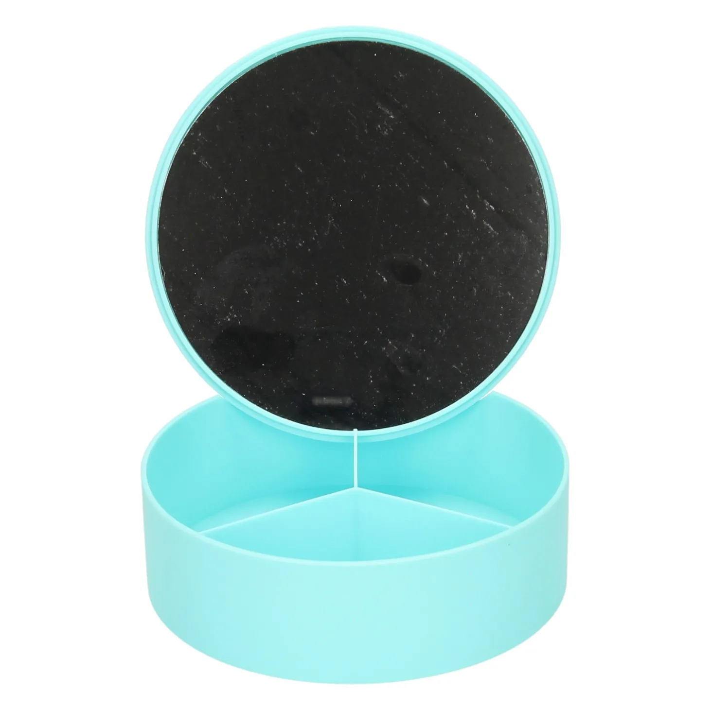 Klein kunststof opbergdoosje met 3 vakken en een spiegeltje (glas) in de deksel. Geschikt voor bijvoorbeeld kleine sieraden of make-up. Wordt geleverd in groen, blauw, roze of wit. Afmetingen: ca. 14 x 5 centimeter.Prijs per stuk, verschillende uitvoeringen/kleuren worden door elkaar geleverd.