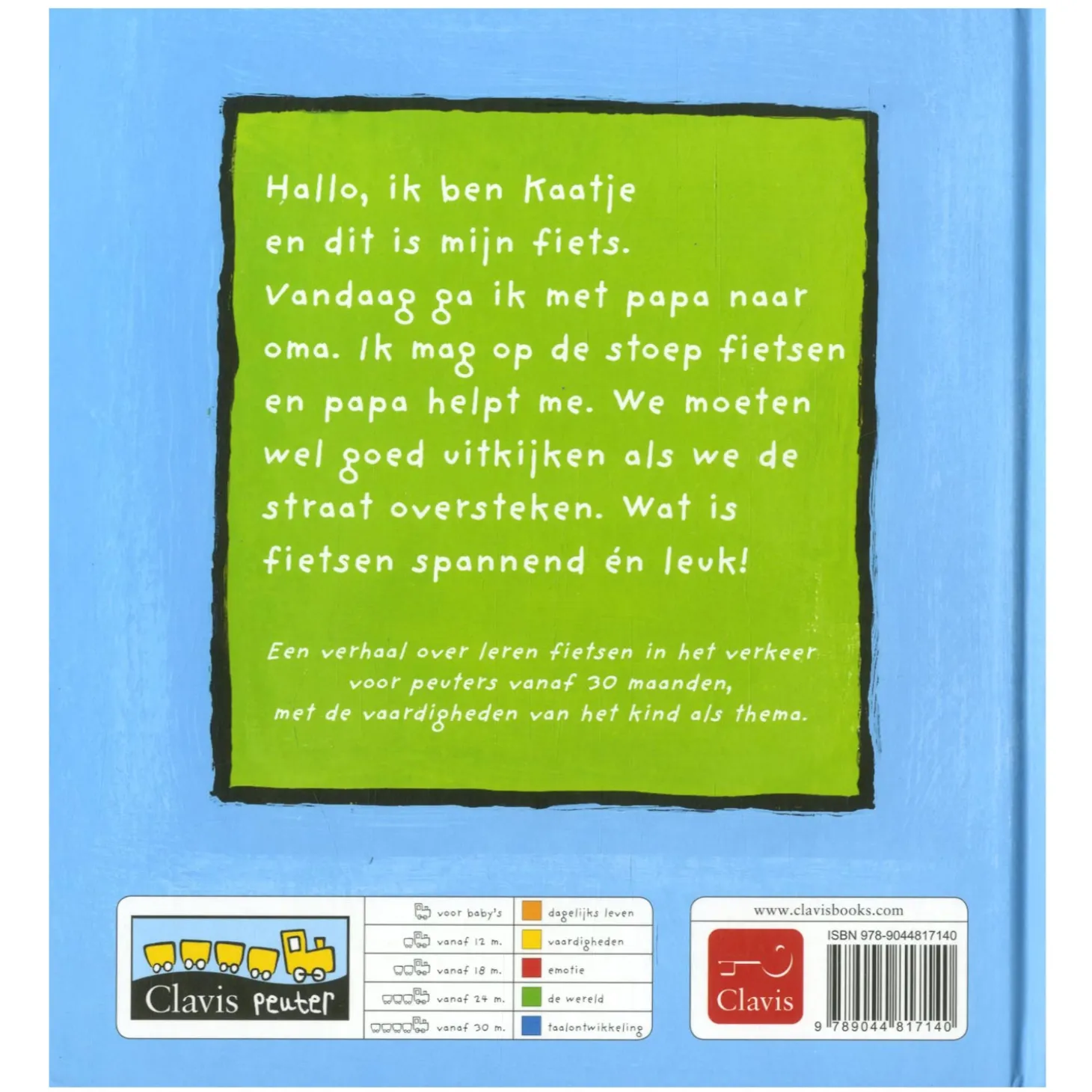 Hallo, ik ben Kaatje en dit is mijn fiets. Vandaag ga ik met papa naar oma. Ik mag op de stoep fietsen en papa helpt me. We moeten wel goed uitkijken als we de straat oversteken. Wat is fietsen spannend én leuk! Een verhaal over leren fietsen in het verkeer.