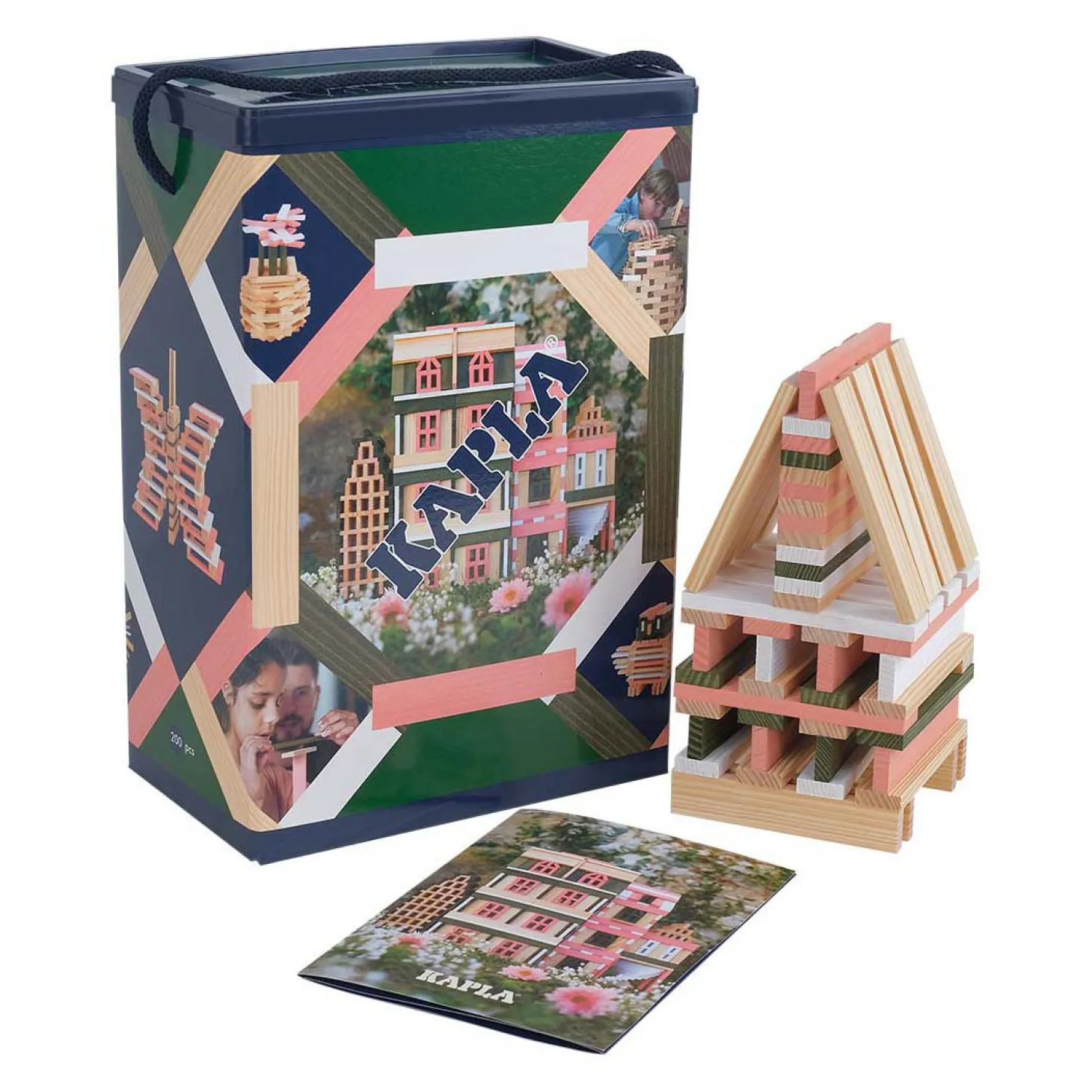 De Lente Barrel bevat 200 natuurlijke Landes grenen planken (x140 Natuurlijk, x20 Wit, x20 Groen, x20 Roze) evenals een A5 formaat drieluik met 3 nieuwe constructies stap voor stap.
