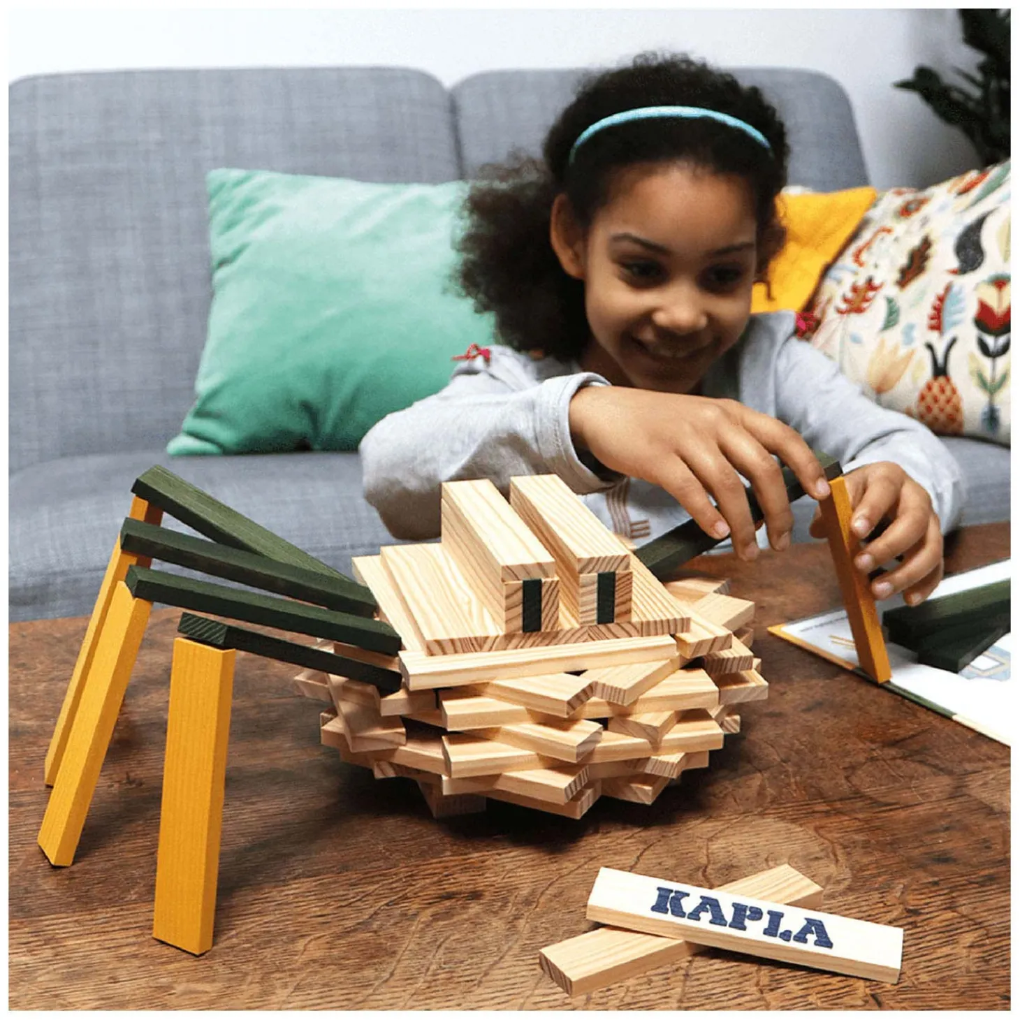 Met de KAPLA-plankjes met identieke afmetingen kan oneindig worden gespeeld en gecreëerd. De plankjes worden eenvoudigweg gestapeld, zonder lijm of bevestiging en kan je bouwen wat in je hoofd opkomt… Een KAPLA-werkje is vergankelijk van nature, en het afbreken is soms net zo prettig als het bouwen. De volgende dag ontstaan met dezelfde plankjes een nieuw universum en andere denkbeeldige structuren…
