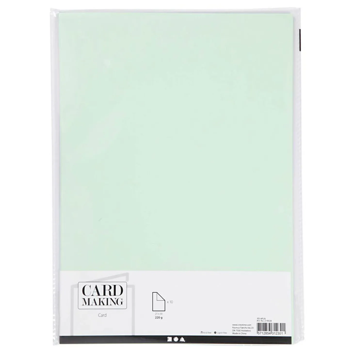 Set van 10 vellen lichtgroen karton in A4-formaat, met een fijne structuur aan één zijde. Perfect voor al je knutselprojecten, van leuke kaarten tot creatieve plakboeken!