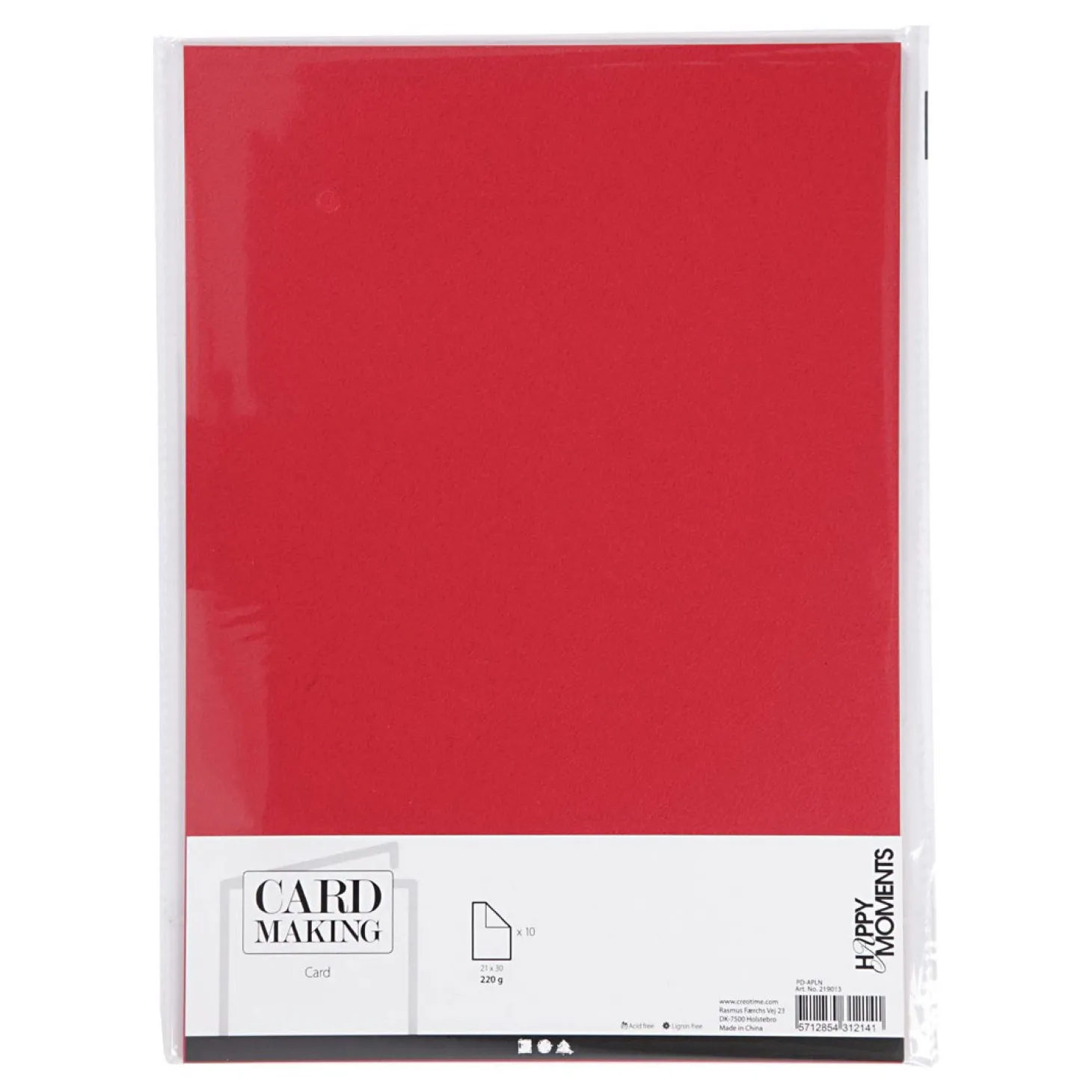 Set van 10 vellen rood karton in A4-formaat, met een fijne structuur aan één zijde. Perfect voor al je knutselprojecten, van leuke kaarten tot creatieve plakboeken!