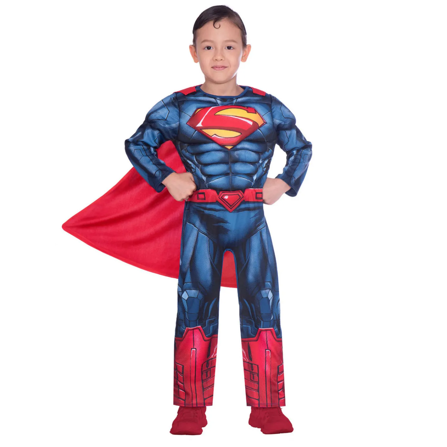 De jumsuit is rekbaar en heeft een realistische sixpackprint. Op de borst staat natuurlijk groot het iconische Superman-logo.