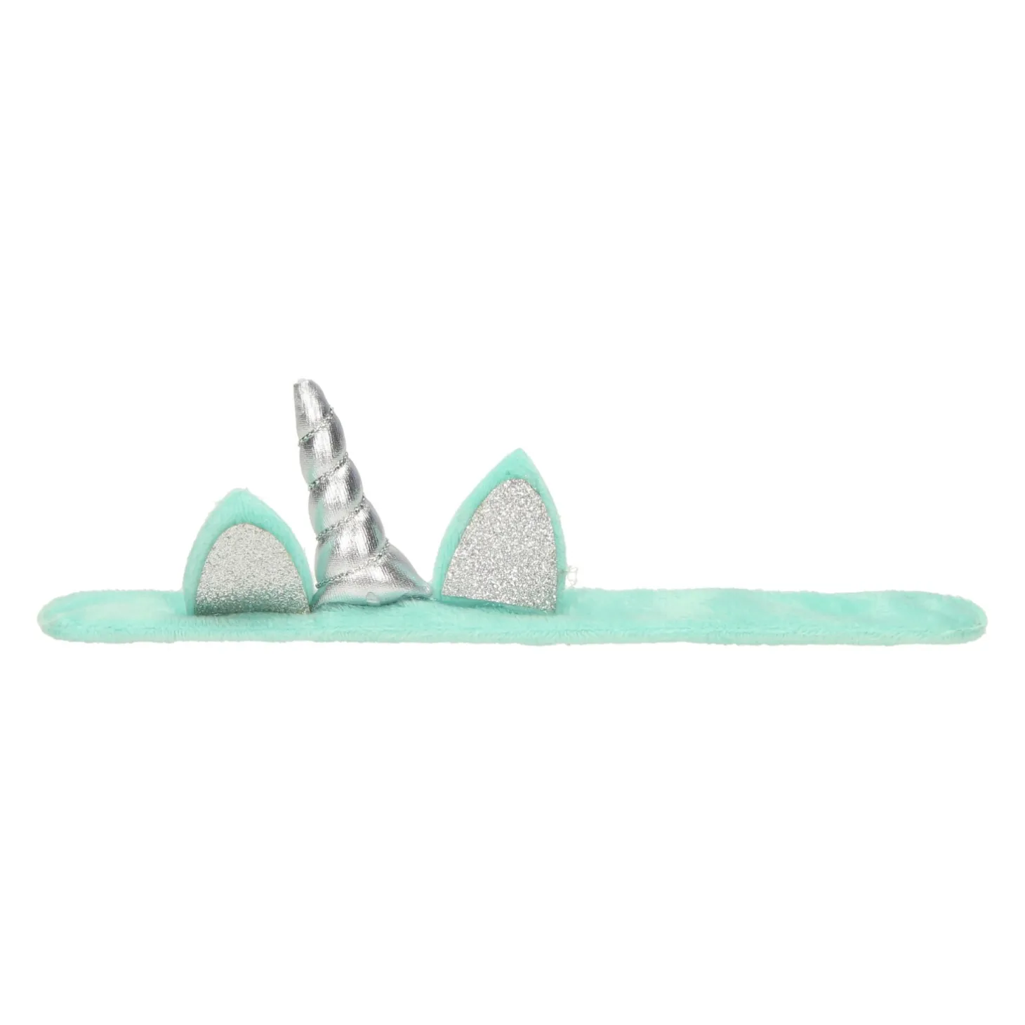 Zachte, pluchen klaparmband die om de arm krult als hij er tegenaan wordt geslagen. De armband is gemaakt van zachte stof en heeft een leuke eenhoorn-hoorn en glitteroortjes. Geschikt voor kinderen vanaf 3 jaar oud.
