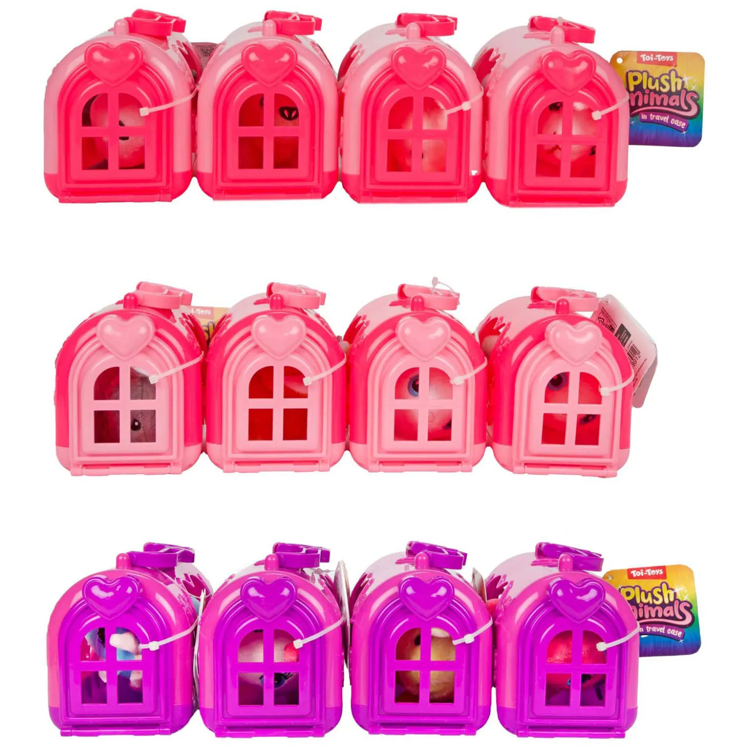 Kunststof draagmandje (roze of paars) met daarin een schattig pluchen knuffeldiertje. Verzamel ze alle 12! Verkrijgbaar in verschillende varianten poes, konijn, unicorn en hond. Afmetingen: 8,5 x 16 x 13 centimeter.Prijs per stuk, verschillende uitvoeringen/kleuren worden door elkaar geleverd.