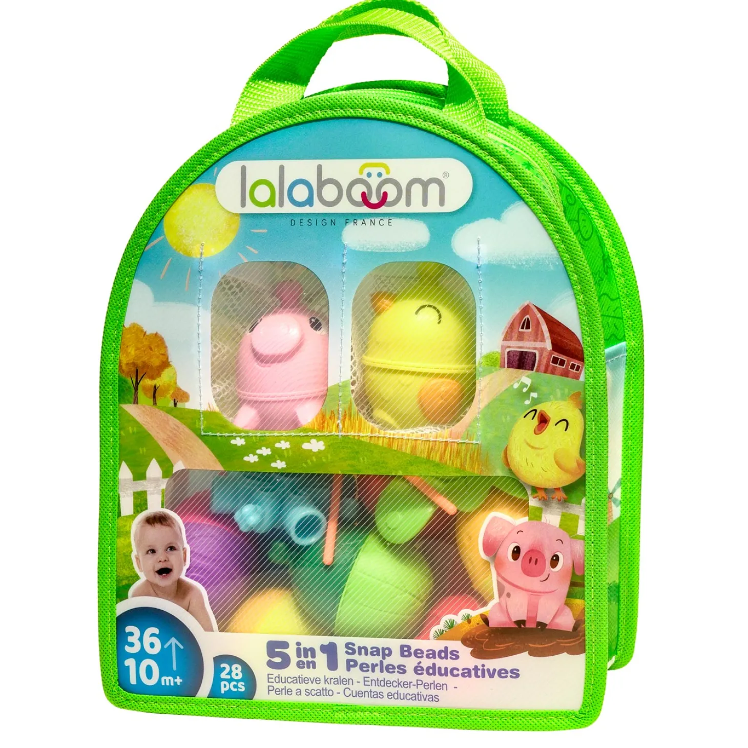 Handige tas met rits met 28 educatieve kralen en accessoires, thema boerderij. Geschikt voor kinderen van 10 maanden tot 3 jaar. Uw kind kan de kralen en al het andere Lalaboom speelgoed met elkaar verbinden voor oneindige speelmogelijkheden. De Lalaboom kralen zijn vaatwasserbestendig.