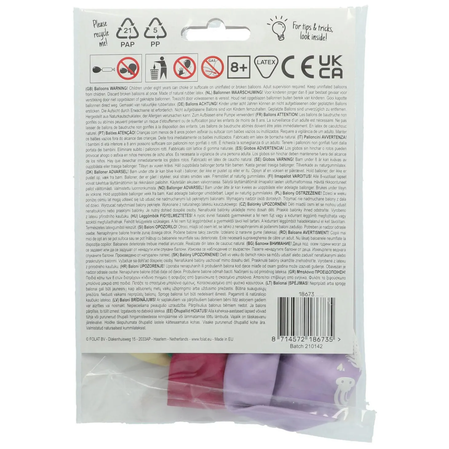 De ballonnen zijn ongeveer 33 centimeter groot en gemaakt van latex. Elke verpakking bevat zes ballonnen in paars, groen, oranje, geel, rood en blauw.