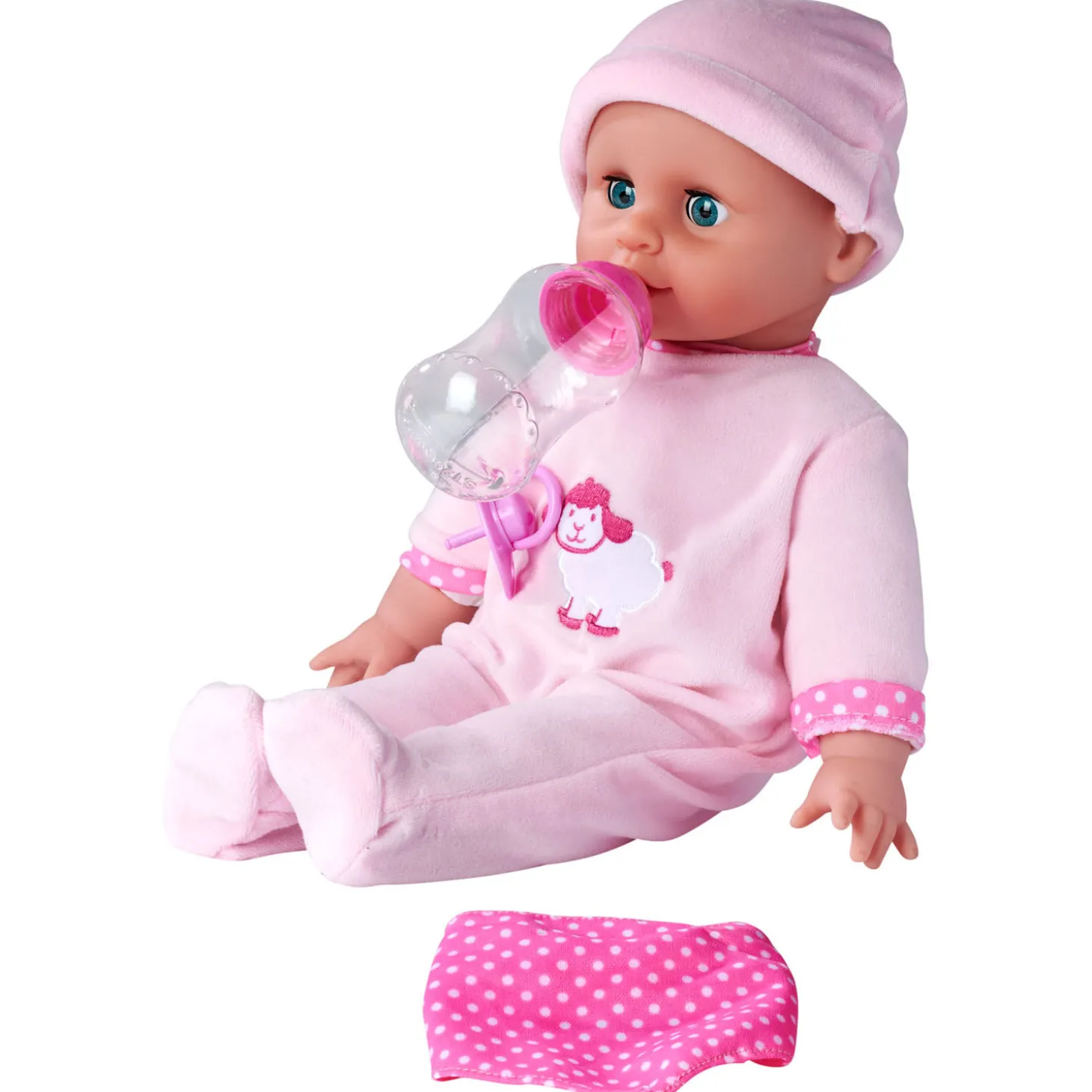 Laura is een zachte babypop die graag een flesje wil! Laat haar haar flesje drinken en geef daarna een speentje om heerlijk mee in slaap te dutten. Ze brabbelt 24 verschillende geluidjes en heeft slaapoogjes die dichtvallen als je haar neerlegt. Inclusief speen, flesje en schattige schaapjespyjama met muts. Geschikt voor kinderen vanaf 2 jaar oud.
