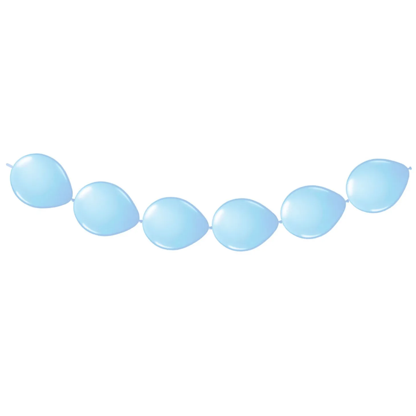 Set van 8 lichtblauwe knoopballonnen. Knoopballonnen zijn ideaal voor het maken van leuke ballonfiguren, bogen of pilaren. Een knoopballon heeft aan de andere kant van de vultuut nog een extra tuutje. Met dit tuutje kunnen de ballonnen aan elkaar vast worden geknoopt. Deze set van 8 ballonnen vormt een slinger van ongeveer 3 meter.