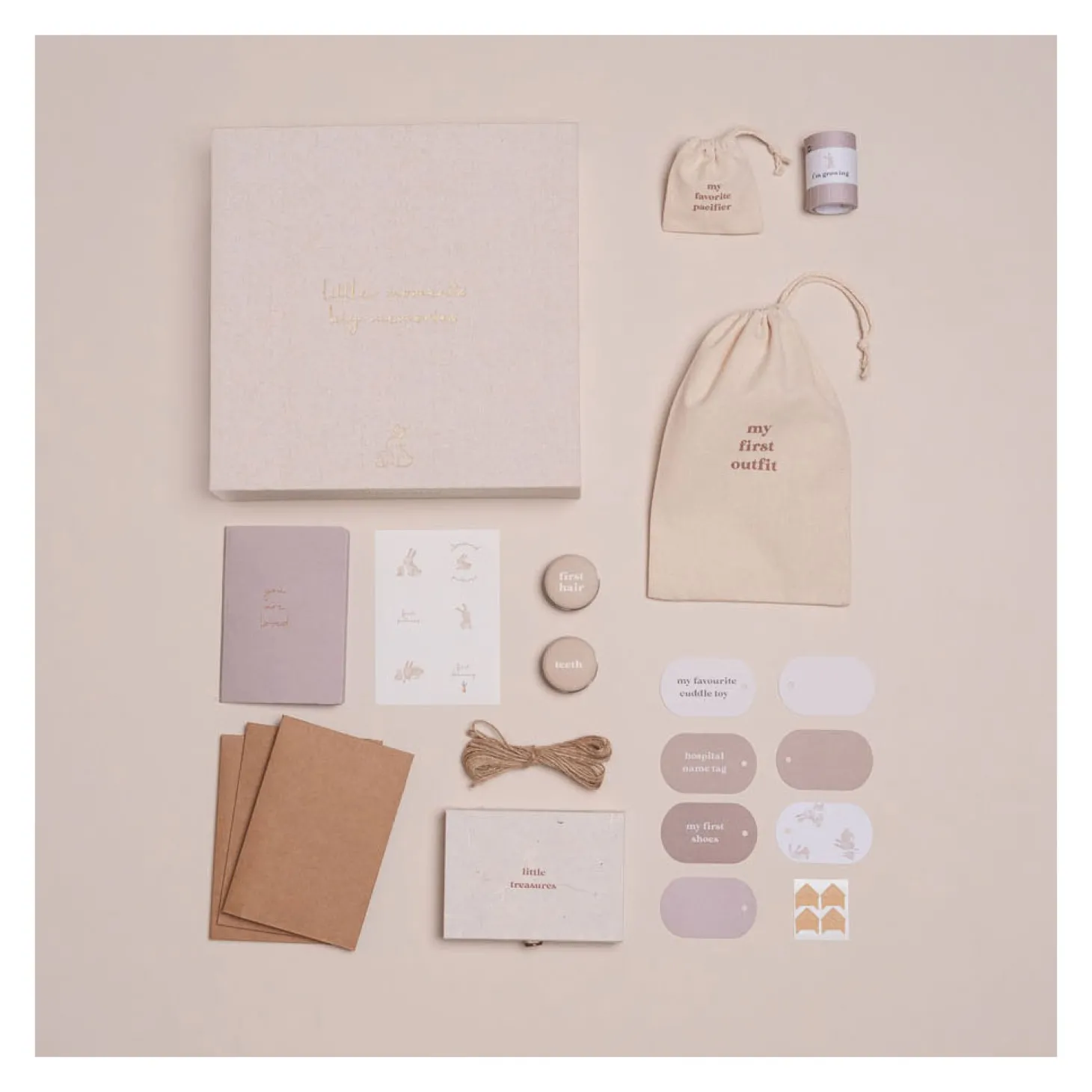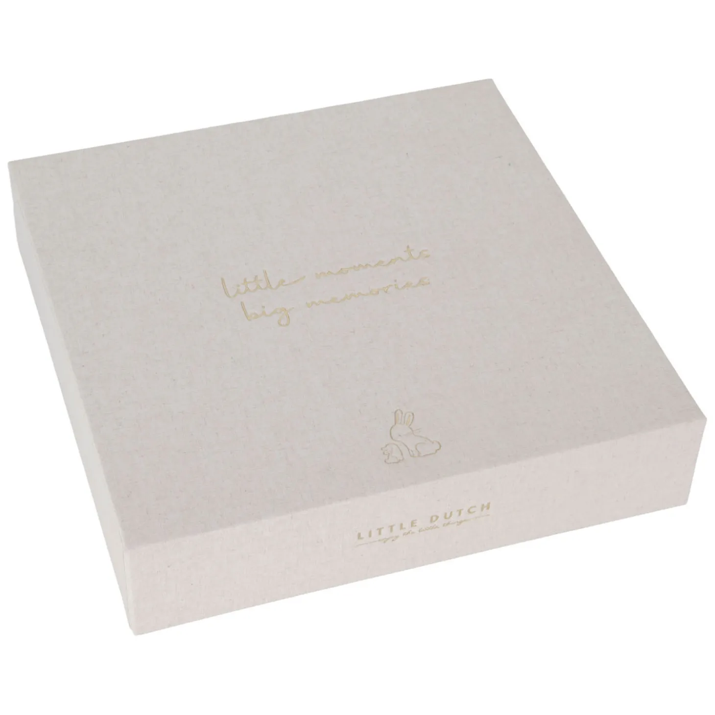 Bewaar de herinneringen van je kindje in deze luxe linnen Little Dutch memory box Newborn Naturals. Deze memory box biedt veel manieren om herinneringen aan belangrijke mijlpalen op een persoonlijke en creatieve manier te bewaren. In de memory box vind je een boekje, tags, jute touw, kraft enveloppen, stickervel, fotohoekjes, tinnen haardoosje, tinnen tandendoosje, Little Treasures bewaardoosje, meetlint, bewaarzakje voor de eerste outfit en een bewaarzakje voor de speen. Hoe leuk om later samen de vele herinneringen en schatten te ontdekken die gezamenlijk bewaard worden in deze prachtige Newborn Naturals box. Op de voorzijde van de memory box staat de quote ‘Little moments, big memories’.