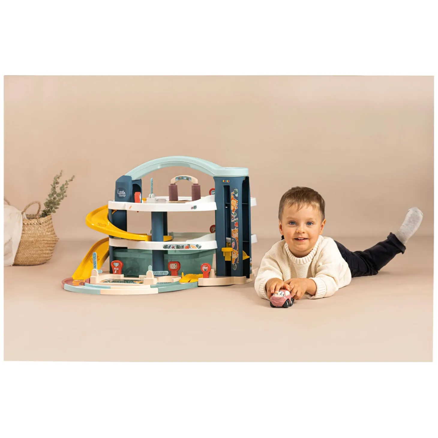 Bij de garage zitten twee voertuigen: één auto en één helikopter. Het totale formaat is 60 bij 62 bij 43 cm. Voor kinderen vanaf 18 maanden is het ideaal speelgoed waarbij ook de ontwikkeling positief gestimuleerd wordt. Hierbij kun je denken aan motorische ontwikkeling, samenspel en verbeelding. De hele set is in Frankrijk geproduceerd van duurzame materialen.