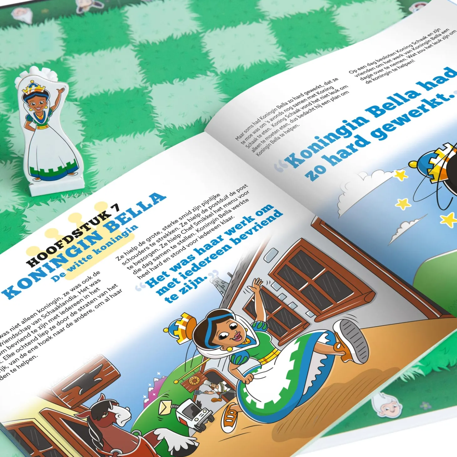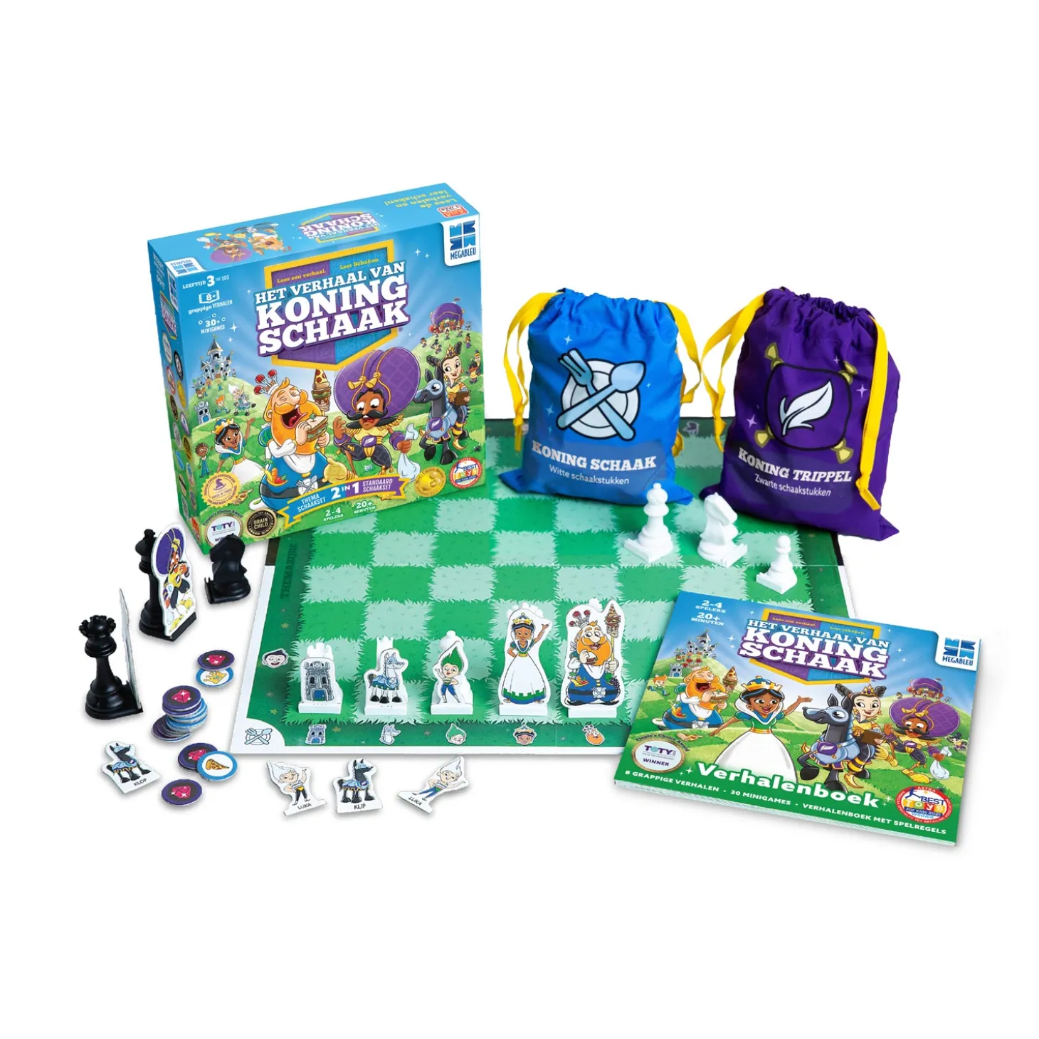 Het Verhaal van Koning Schaak is een bordspel dat jonge kinderen leert schaken met behulp van gekke verhalen, levendige illustraties, aangepaste schaakstukken en een uniek schaakbord.