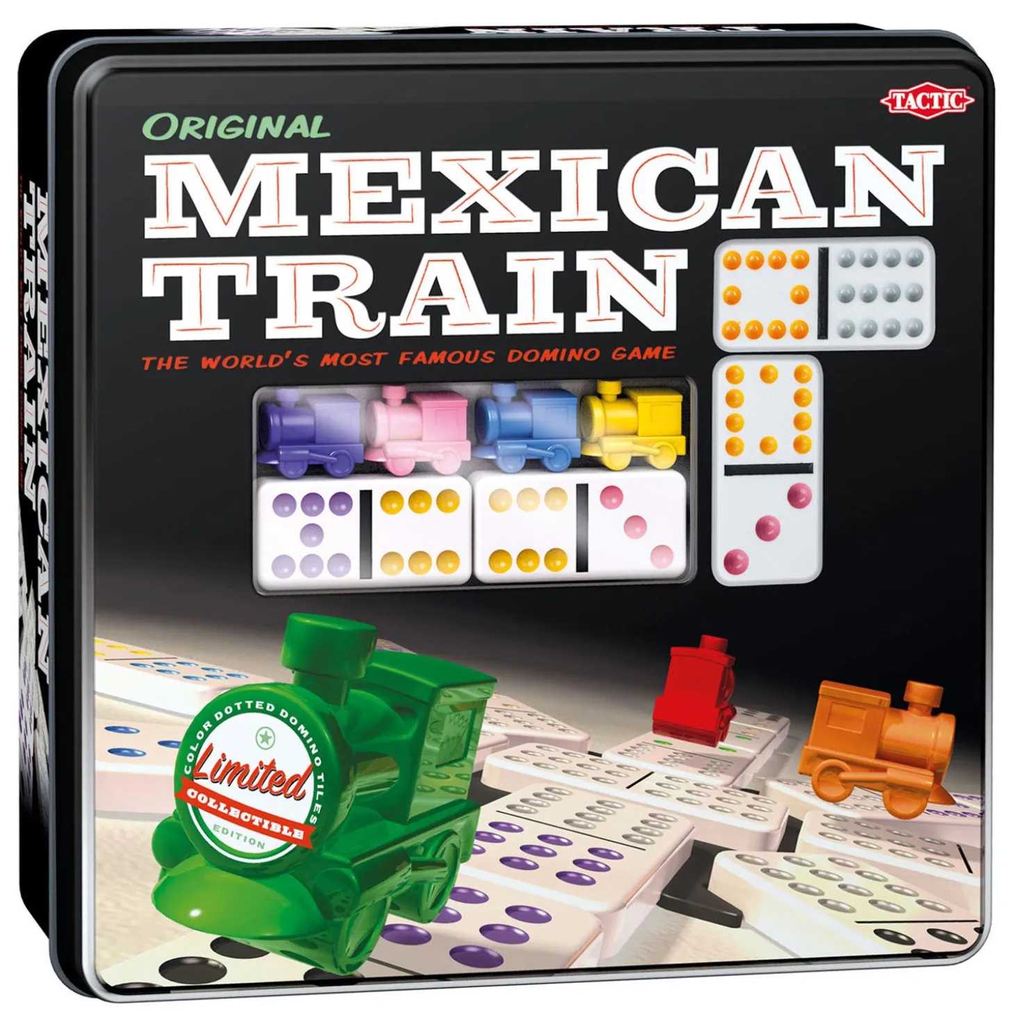 Elke speler probeert vanuit het midden een rij van dominostenen aan te leggen. Je mag ook aanleggen aan de gezamenlijke rij, dat is de Mexican Train. Het spel heeft dominostenen van hoge kwaliteit en leuke treinpionnen. Het populairste dominospel ter wereld! De set bestaat uit 91 gekleurde dubbele dominostenen, treinstation middenstuk, 8 markeertreintjes, spelregels en komt in een mooie tinnen doos.