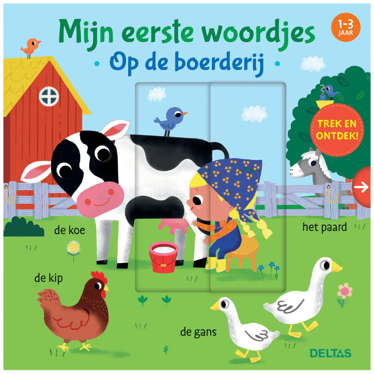 Dit interactieve kartonboekje is speciaal gemaakt voor kinderen die graag veel nieuwe woorden leren. Op elke pagina zijn er stevige flapjes om aan te trekken en al spelend woorden te ontdekken. De koe, de tractor, de eieren… De boerderij leren kennen was nog nooit zo leuk! Voor kleine ontdekkers van 1 tot 3 jaar.