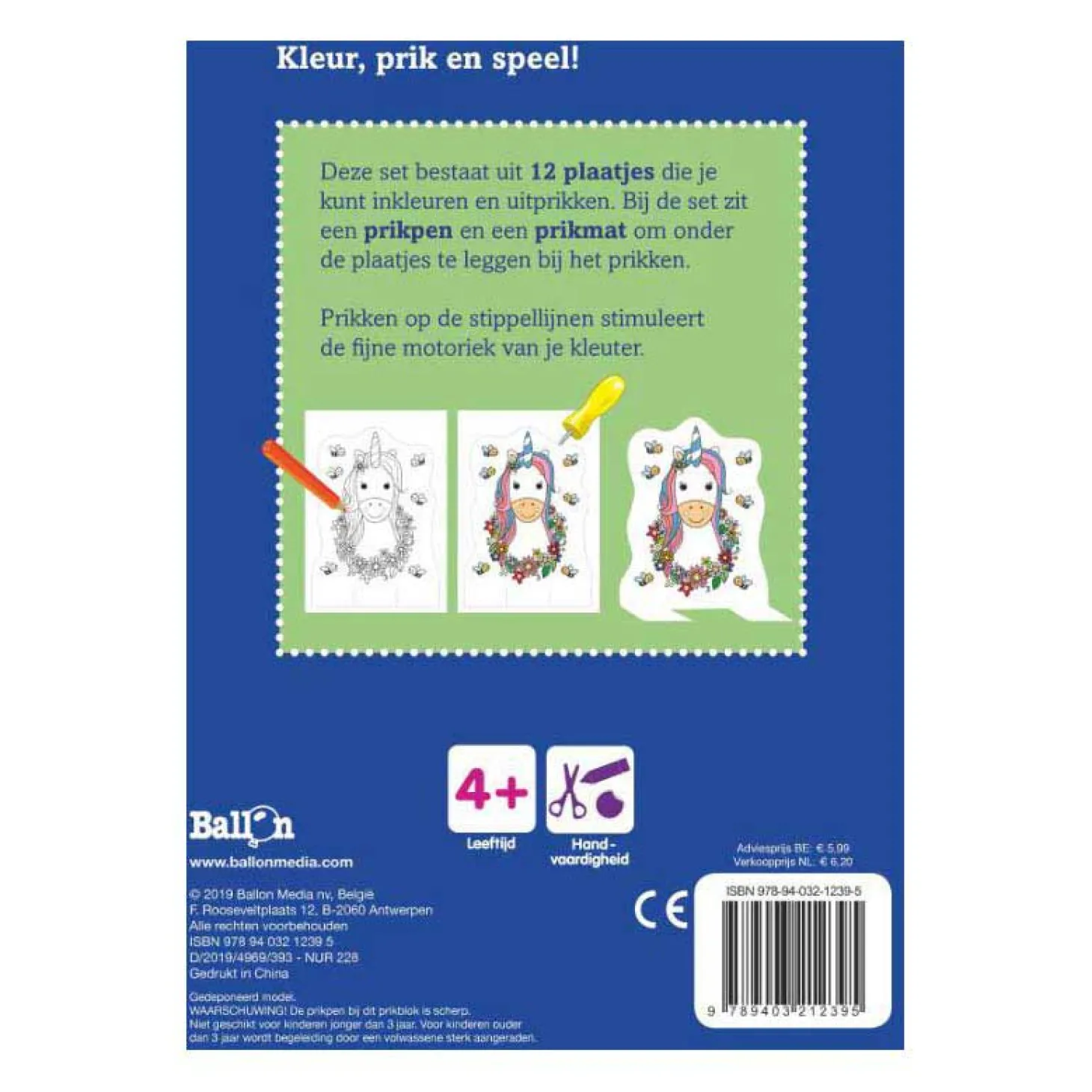 Bij de set zit een prikpen en een prikmat om onder de plaatjes te leggen bij het prikken. Prikken op de stippellijnen stimuleert de fijne motoriek van je kleuter.