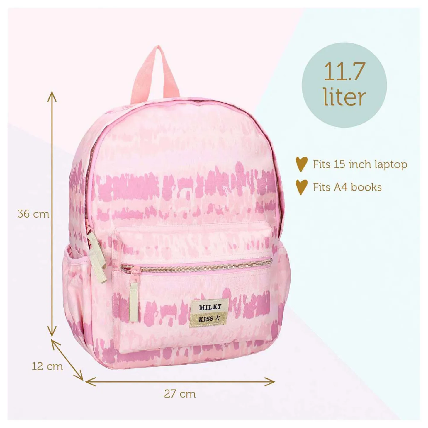 De verstelbare schouderbanden zorgen voor extra draagcomfort, terwijl het hengsel bovenop het gemakkelijk maakt om de tas ook in de hand te dragen. Het subtiele Milky Kiss-logo op het voorvak geeft de rugzak een stijlvolle afwerking. Ideaal voor school, uitstapjes of gewoon als modieuze accessoire!