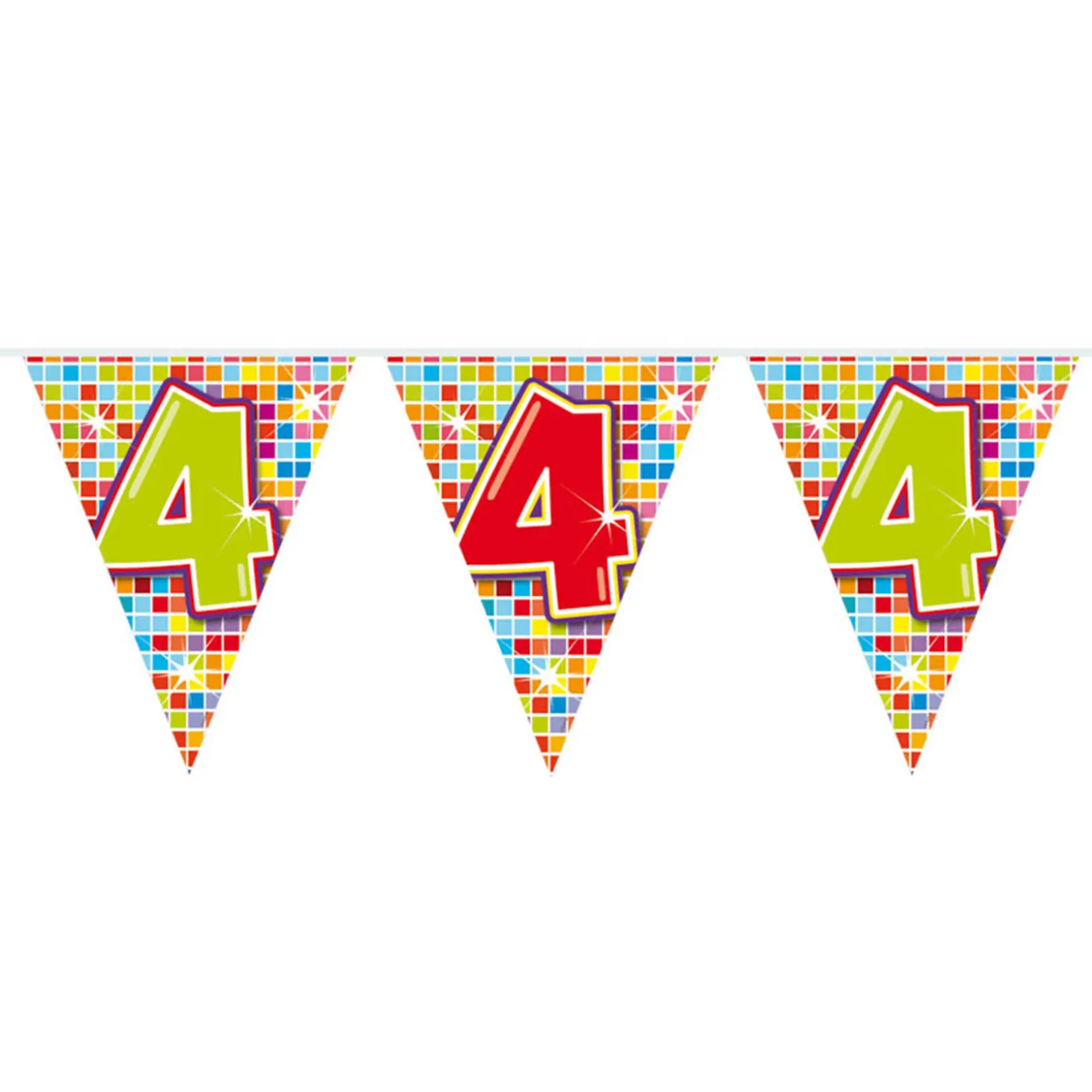 Wordt de kleine alweer 4 jaar? Of vieren jullie een 4-jarig jubileum? Deze kleurrijke slinger staat perfect op ieder soort feestje! De slinger is enkelzijdig bedrukt, heeft 12 vlaggetjes en is 3 meter lang.