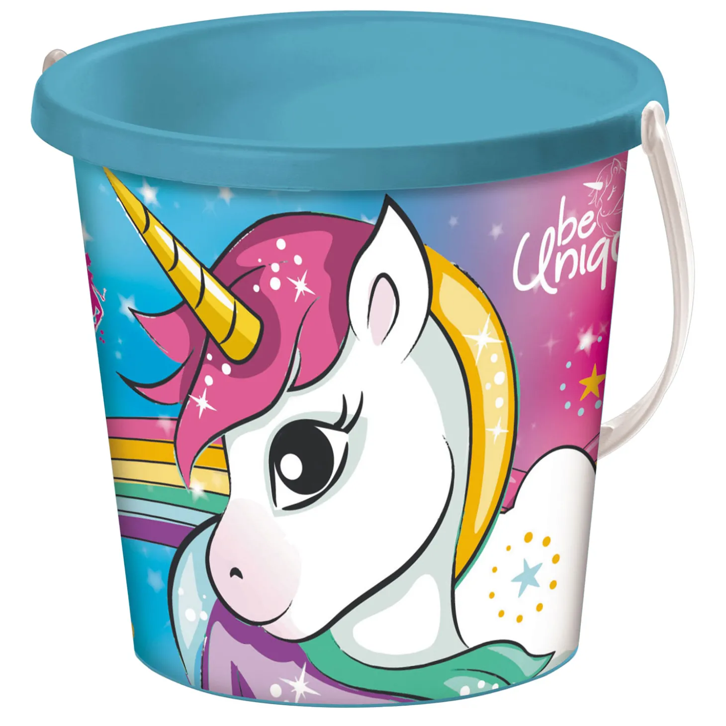 Mondo kunststof emmer (blauw) met een afbeelding van een unicorn. Diameter: 17 centimeter.