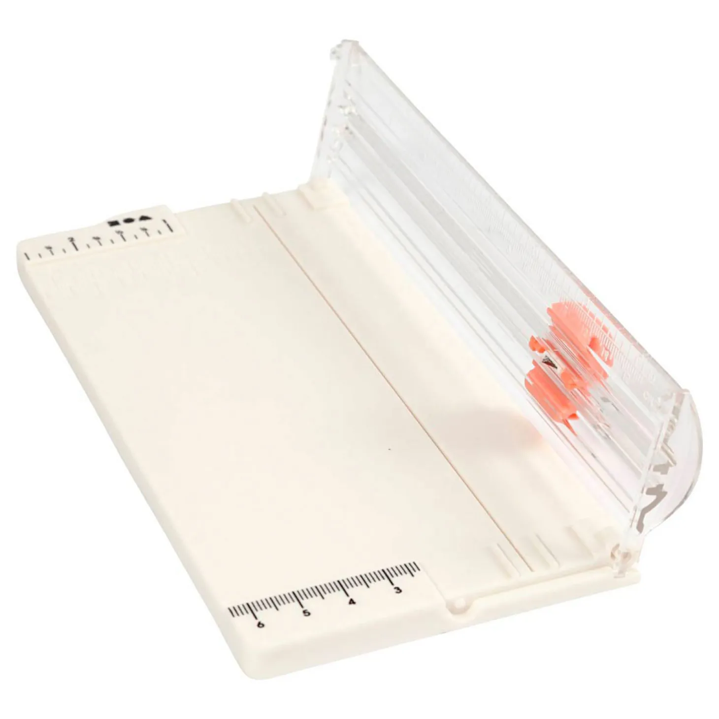 Draagbare snijmachine met kunststof oppervlak, gedrukte rasterlijnen en inklapbare liniaal. Kan tot 5 vellen 80grams papier tegelijkertijd snijden.