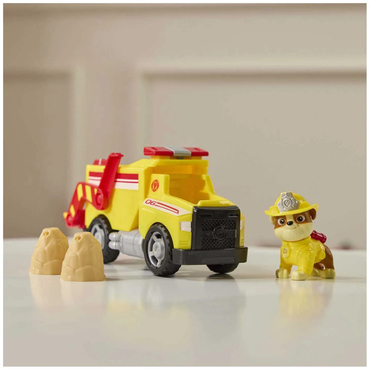 Kinderen kunnen heldhaftige missies naspelen: laad de twee meegeleverde speelrotsen in de kiepbak, trek aan de hendel en lanceer ze om de dag te redden! Rubble is ruim 5 cm groot en draagt zijn speciale brandweeruitrusting.