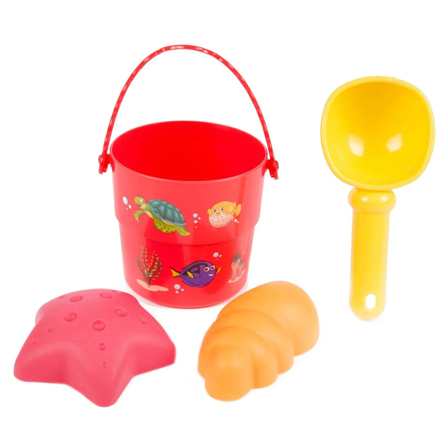 Vrolijk 4-delig strandsetje bestaande uit een emmertje met hengsel, een schepje en 2 zandvormen. Het emmertje is 15 x 8 centimeter groot en heeft een leuke zeedierenprint. Gemaakt van kunststof.Prijs per stuk, verschillende uitvoeringen/kleuren worden door elkaar geleverd.