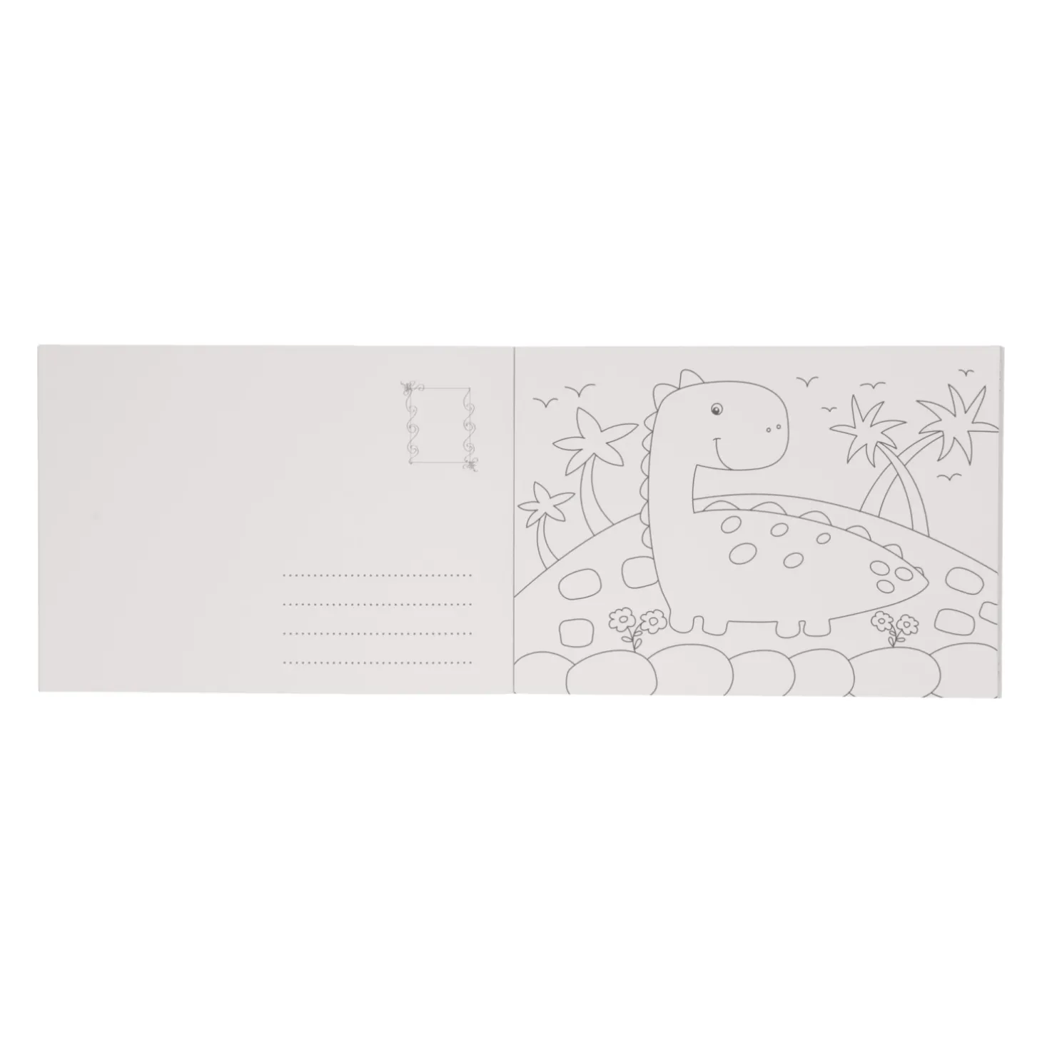 Het tekenboekje bevat 20 verschillende dinosaurus kleurplaten met achterop ruimte om te schrijven. Het formaat is 16,5 x 12 cm.