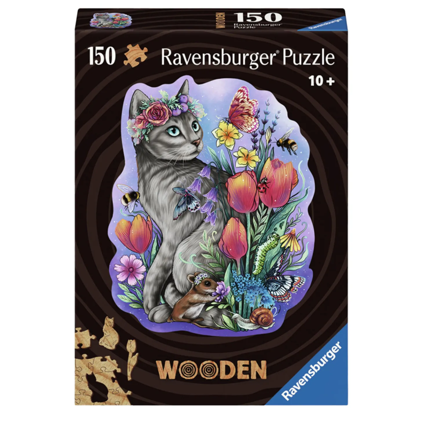 Lovely cat houten contourpuzzel met 150 stevige, onregelmatig gevormde puzzelstukjes en met WHIMSIES: kleine houten figuren, die bij het motief passen.