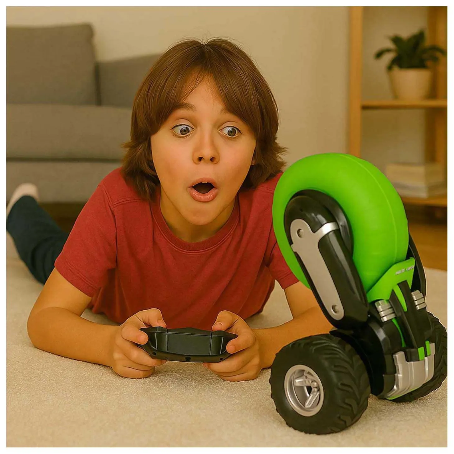 Maak kennis met de Gear2Play RC Air Rebound, de spectaculaire zwart-groene stuntauto met 3 wielen! Dankzij zijn unieke design met twee robuuste achterbanden en een grote opblaasbare voorband is deze auto gebouwd voor actie. Flip, spin en bounce over obstakels, trappen en tegen muren – niets houdt deze stunter tegen! Met de controller laat je hem 360° spins, coole wheelies en stunts op 3 wielen uitvoeren. De voorband vangt klappen op en stuitert krachtig terug – en dankzij de meegeleverde pomp is hij altijd weer klaar voor actie. Dit is fun op volle snelheid! Leeftijdsindicatie: 8 jaar+. Ready to Run: inclusief batterijen, dus direct speelplezier! De auto werkt op een krachtige, meegeleverde 7.4V oplaadbare batterij en wordt opgeladen via USB. De controller werkt op 2 x AA batterijen (meegeleverd). Afmeting auto: 30x24x15cm (lxbxh).