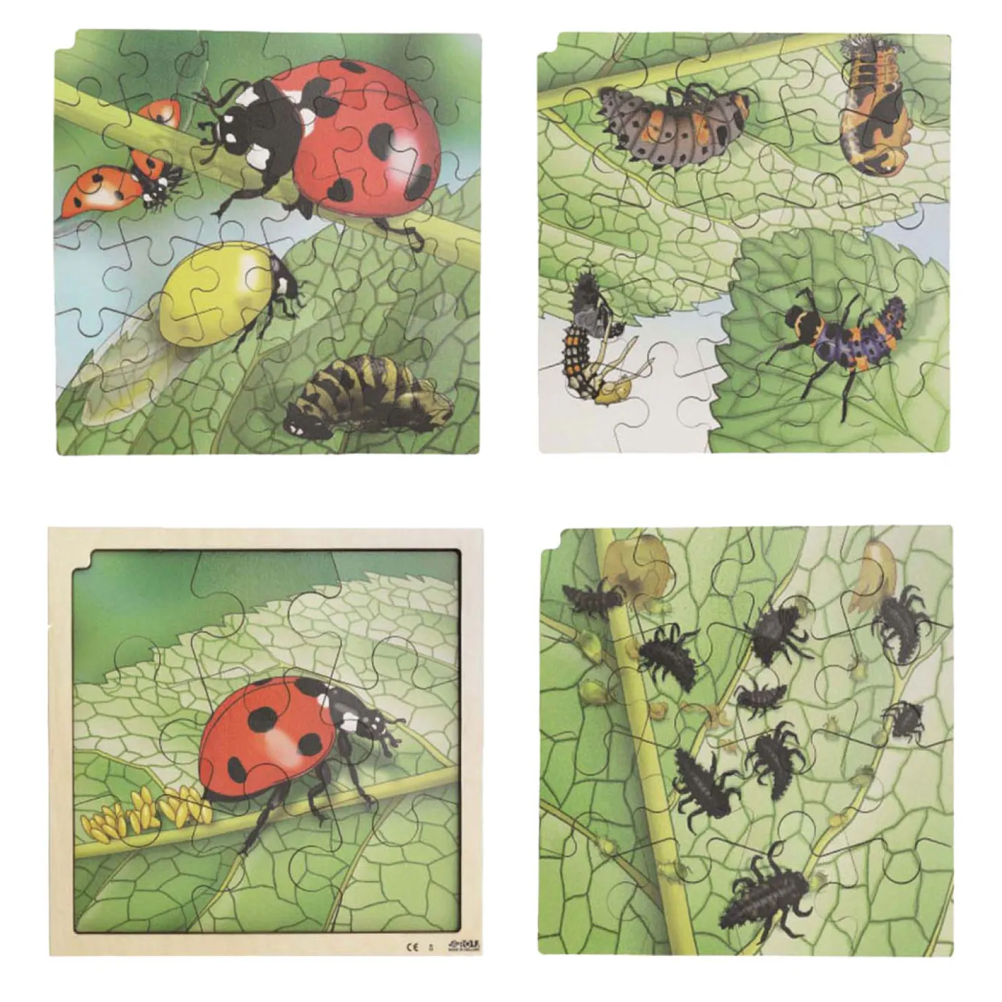 De groeipuzzels in deze serie zijn 28 x 28 cm bestaan uit 4 lagen. Het aantal stukjes loopt per laag op: van 9, 16, 25 tot 36. Dankzij nieuwe technieken als ‘Augmented reality’ komen de puzzels echt tot leven. Download de gratis Rolf App en bekijk een filmpje dat bij de betreffende puzzelllaag hoort, zodat je elk stadium van het dierenleven meebeleeft. Kinderen kunnen via de app ook vragen beantwoorden over het betreffende dier. Leuk en leerzaam!