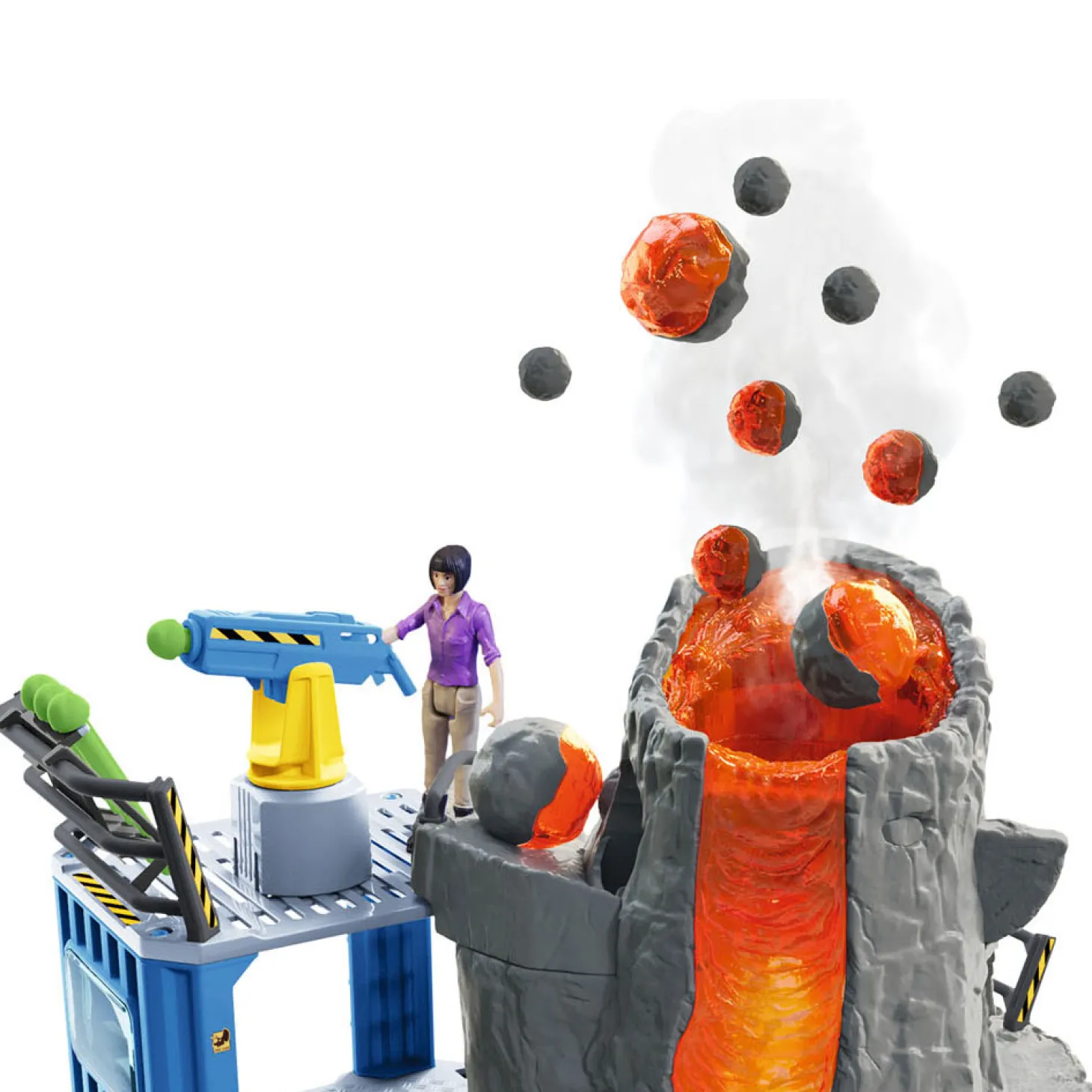 Inhoud: 1x dinosaurusonderzoekster Yuki, 1x Giganotosaurus, 1x Ankylosaurus, 1x vulkaan, 1x container, 1x reling container, 1x reling brug, 1x brug, 1x reling bovenkant, 1x reling hoek, 1x munitiehouder, 1x stenen knikker, 1x steen groot, 3x steen middel, 4x steen klein, 2x kristal groot, 2x kristal klein, 1x liane, 2x plant groot, 3x plant klein, 1x stalactieten, 4x knoopcelbatterijen.