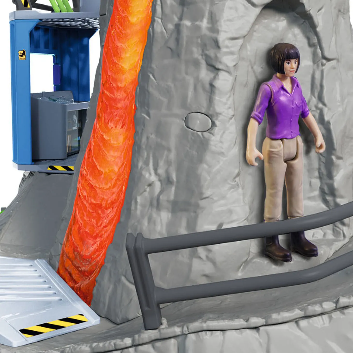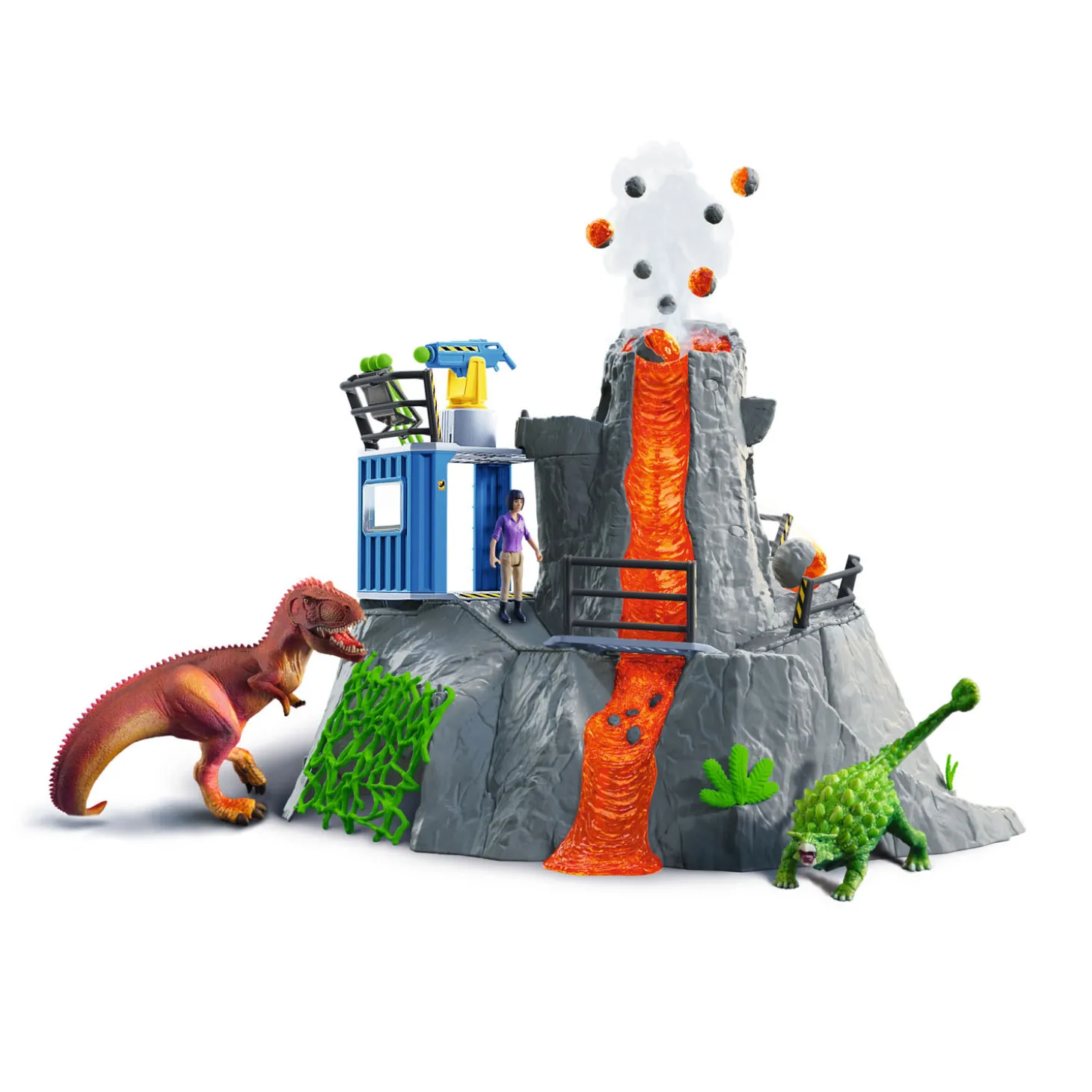 Inhoud: 1x dinosaurusonderzoekster Yuki, 1x Giganotosaurus, 1x Ankylosaurus, 1x vulkaan, 1x container, 1x reling container, 1x reling brug, 1x brug, 1x reling bovenkant, 1x reling hoek, 1x munitiehouder, 1x stenen knikker, 1x steen groot, 3x steen middel, 4x steen klein, 2x kristal groot, 2x kristal klein, 1x liane, 2x plant groot, 3x plant klein, 1x stalactieten, 4x knoopcelbatterijen.