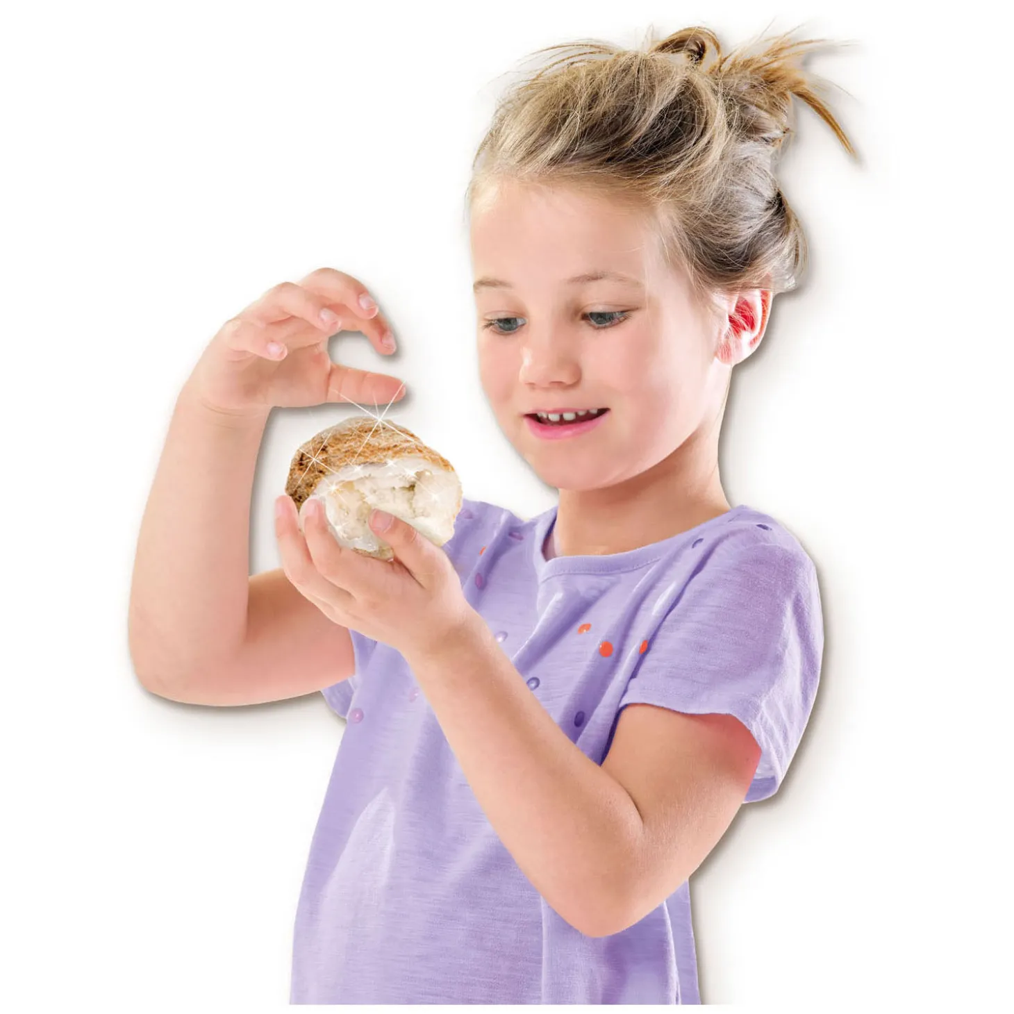 De set bestaat uit drie geode stenen, een zakje en instructies. De hamer is niet inbegrepen.