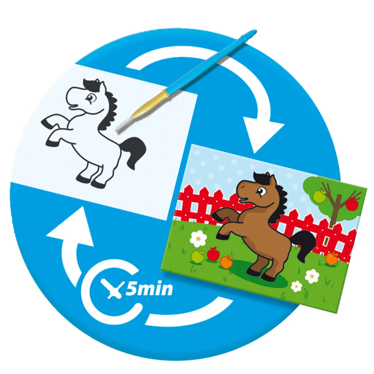 Artikelnr. SES 14421. Magie met water en verven zonder geknoei! Dat kan met deze unieke set van SES. Ga met een natte kwast over de voorbedrukte kaarten en zie hoe de kleurplaat zichtbaar wordt. De kwast is veilig te gebruiken, omdat de haren niet kunnen uitvallen. Na opdrogen steeds opnieuw te gebruiken. Inhoud: veilige kwast en 4 voorbedrukte kaarten.