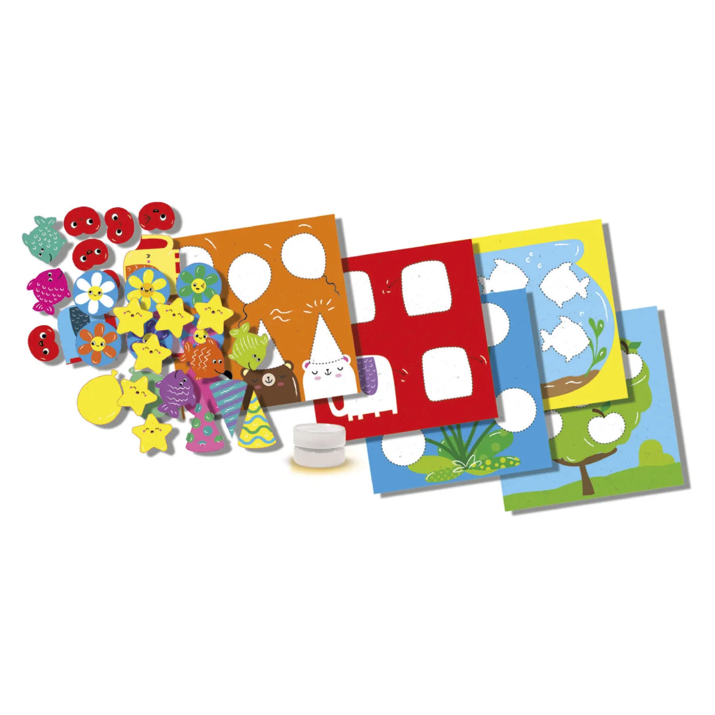 Waar horen appels? Aan de boom! En sterren? In het heelal! Smeer met je vinger wat lijm op de open plekken van de kaarten en plak hier het juiste vormpje op. Zo leer je op een speelse manier vormen herkennen en train je ook al een beetje je fijne motoriek. De lijm is goed uitwasbaar. Inhoud: 6 bedrukte kaarten, plakvormpjes en lijm.