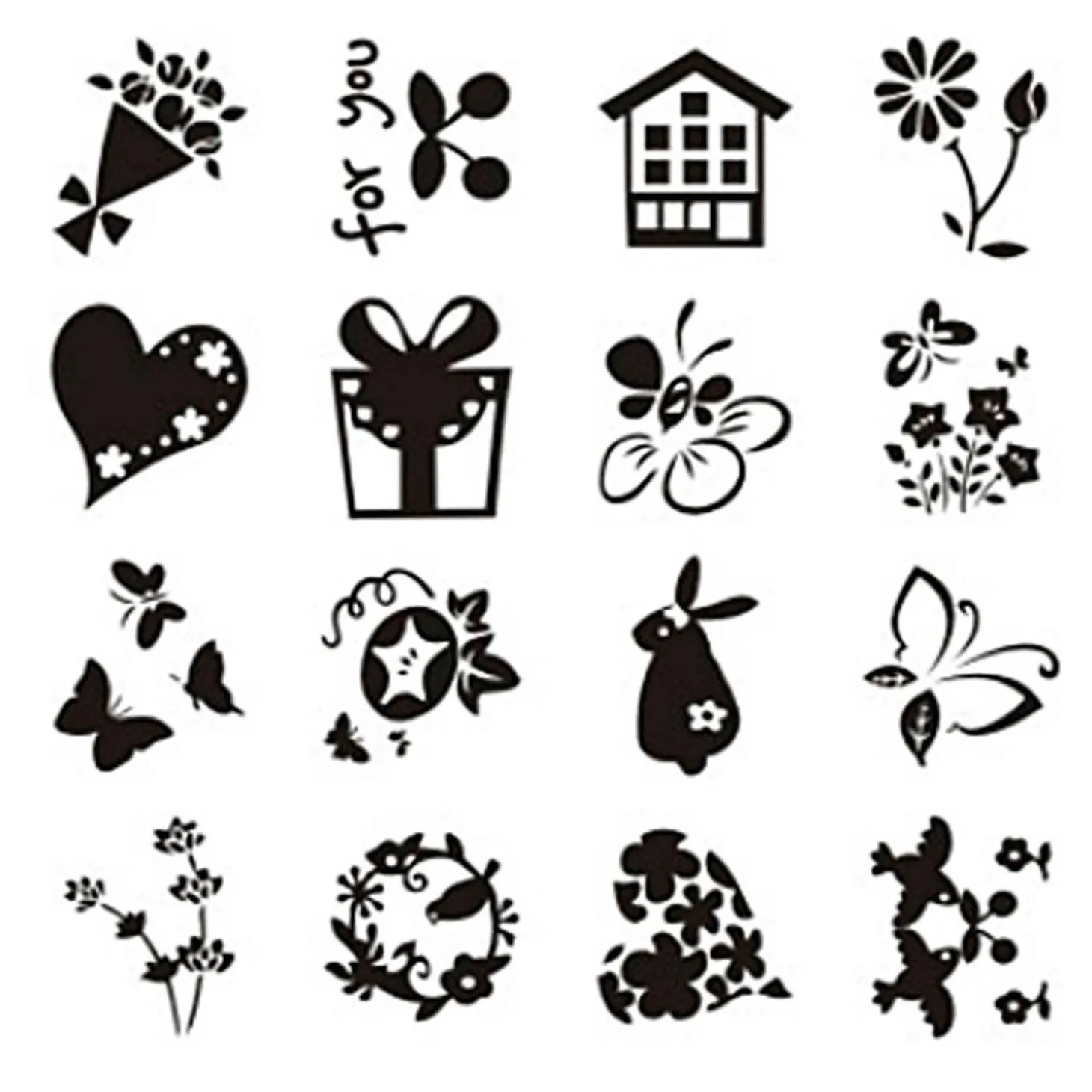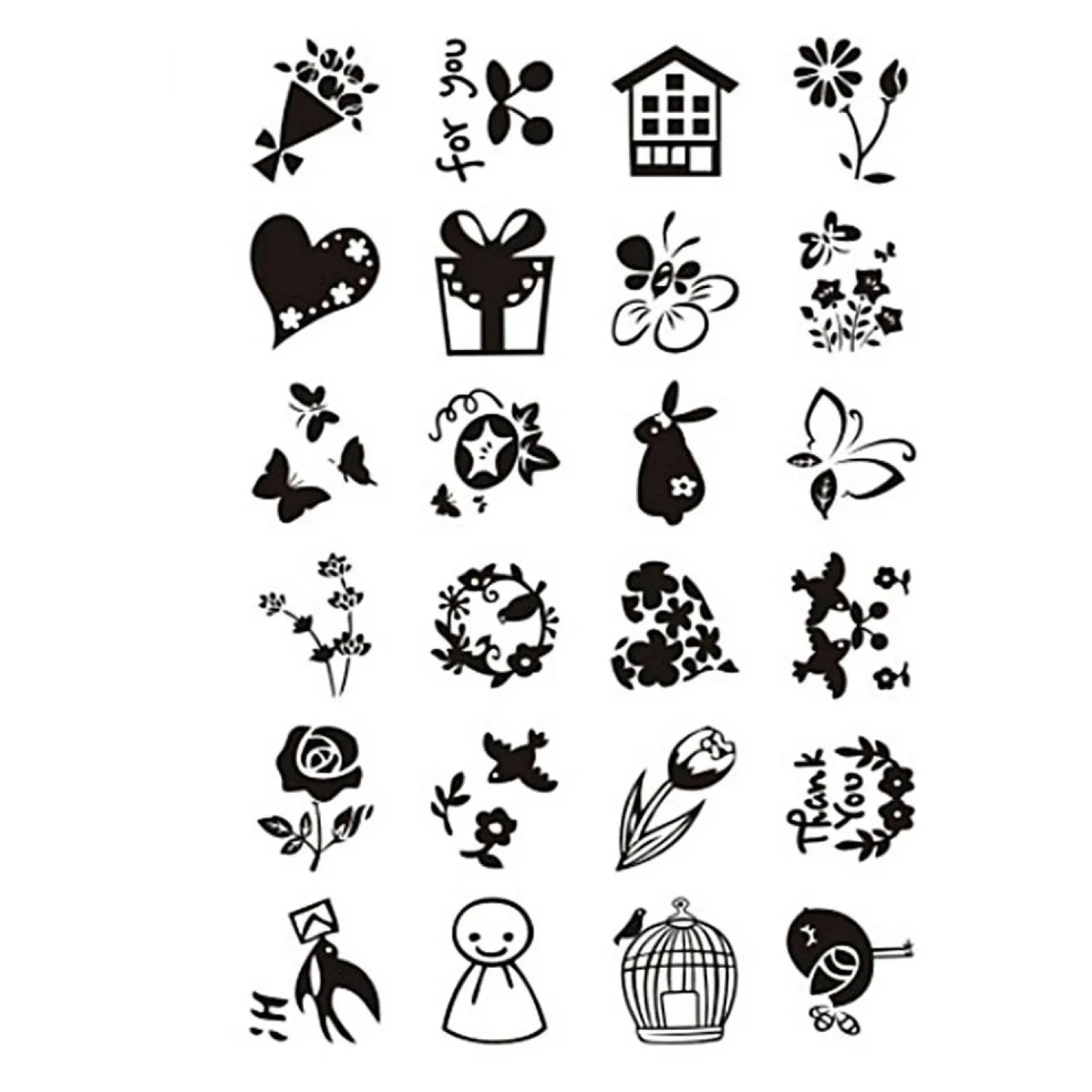 Vel met verschillende motieven silicone stempels. Te gebruiken met een acryl stempelblok (artikelnr. 6023031).
