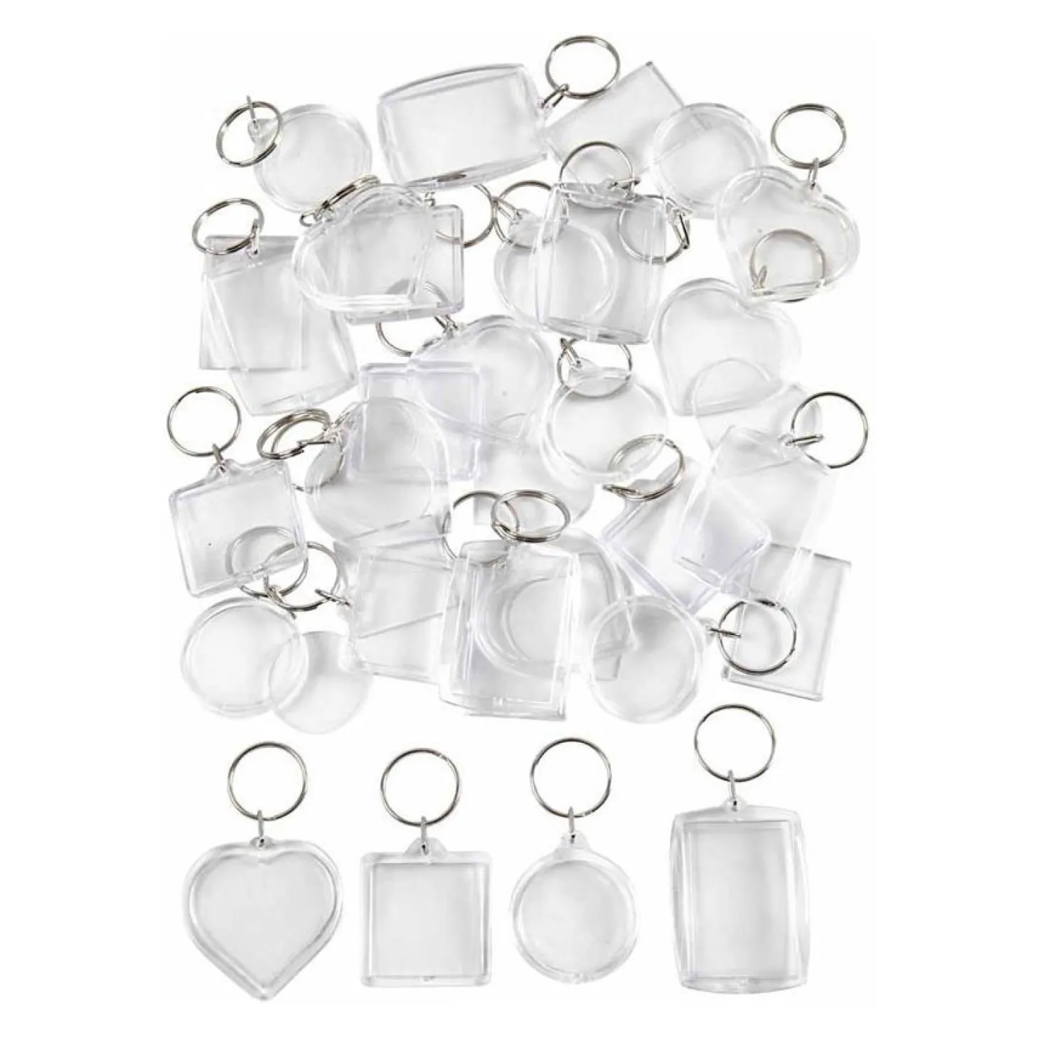 Sleutelhanger van transparant acryl – met sleuf om tekeningen, foto’s etc erin te doen.Inhoud: 4 designs van elk 25 stuks