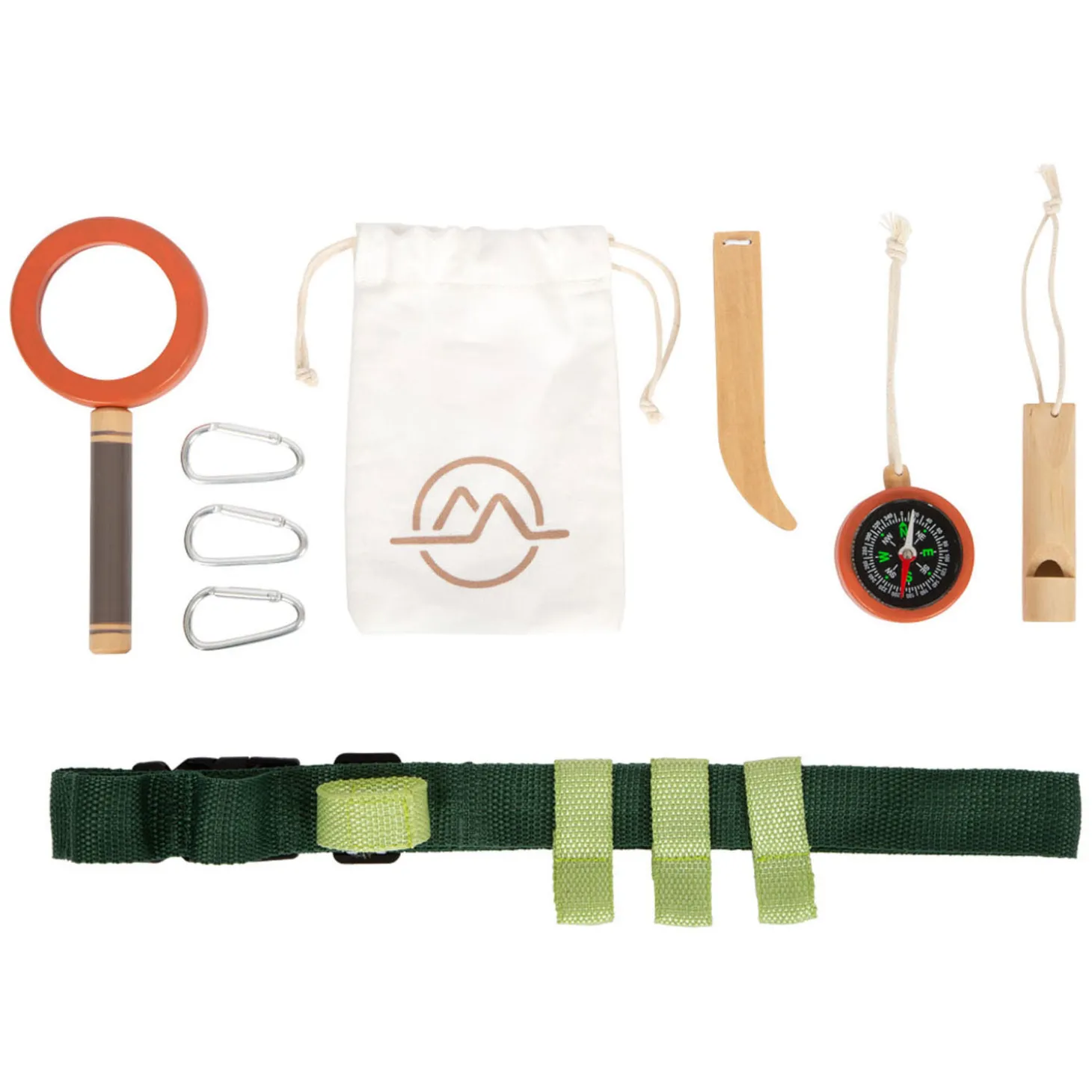 • Incl. karabijnhaken, signaalfluit van massief hout, vergrootglas met vergrotingsfunctie, pincet, kompas, touw en katoenen zak om dingen uit de natuur te verzamelen