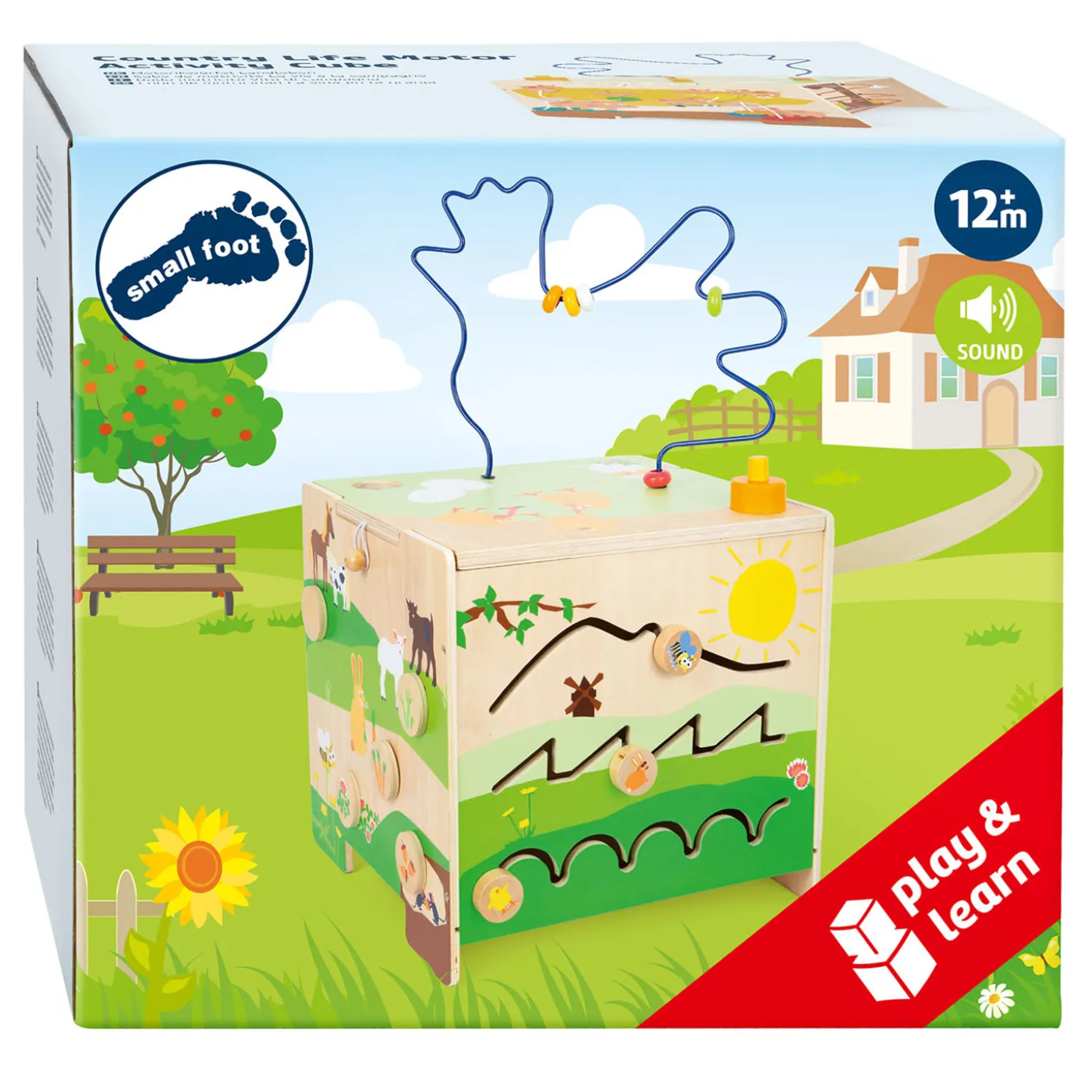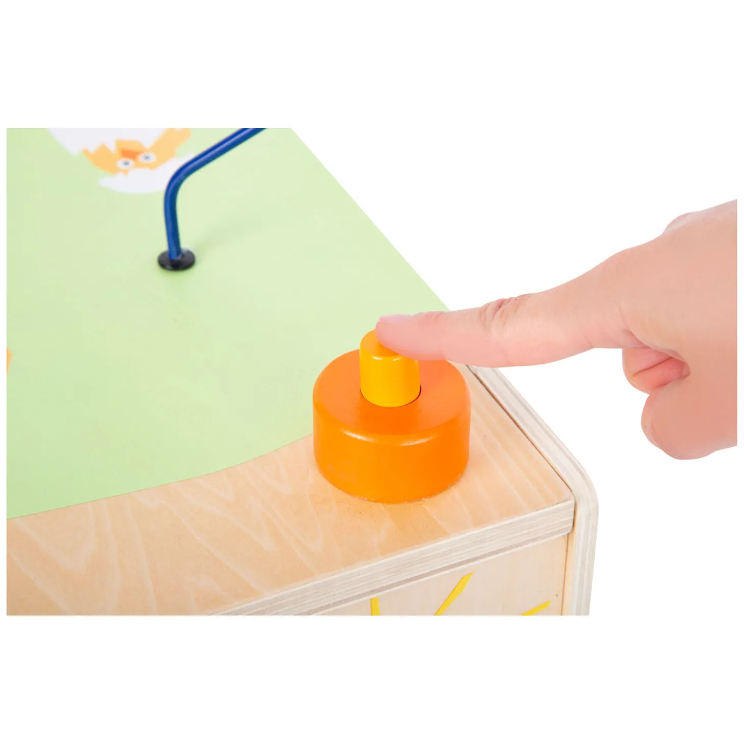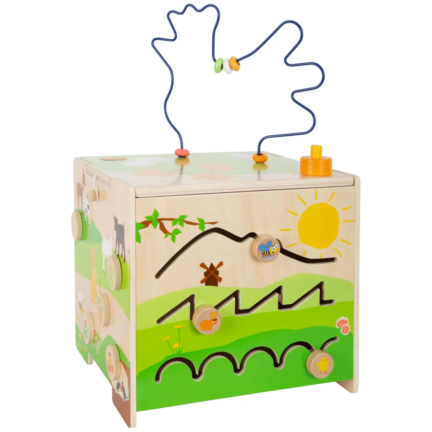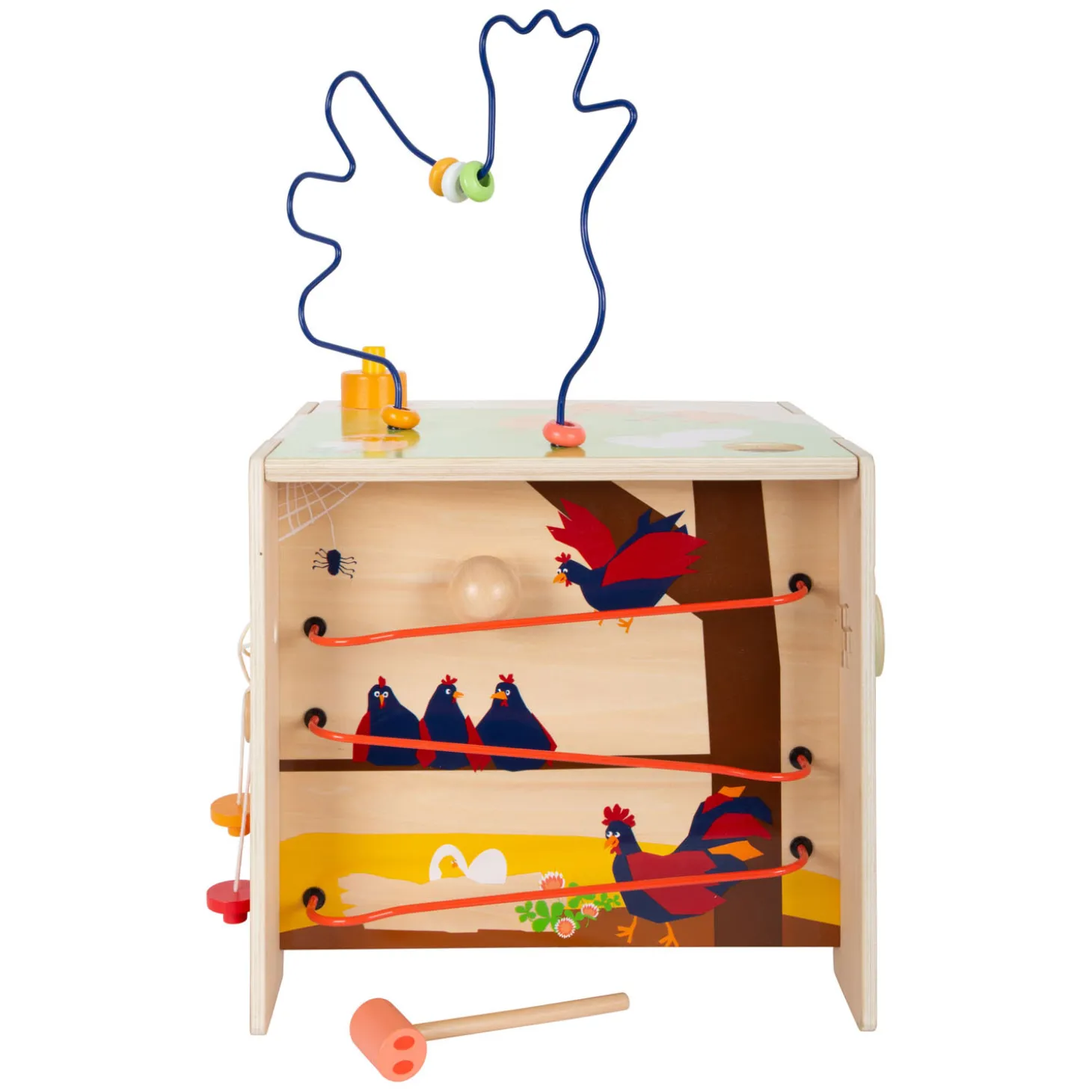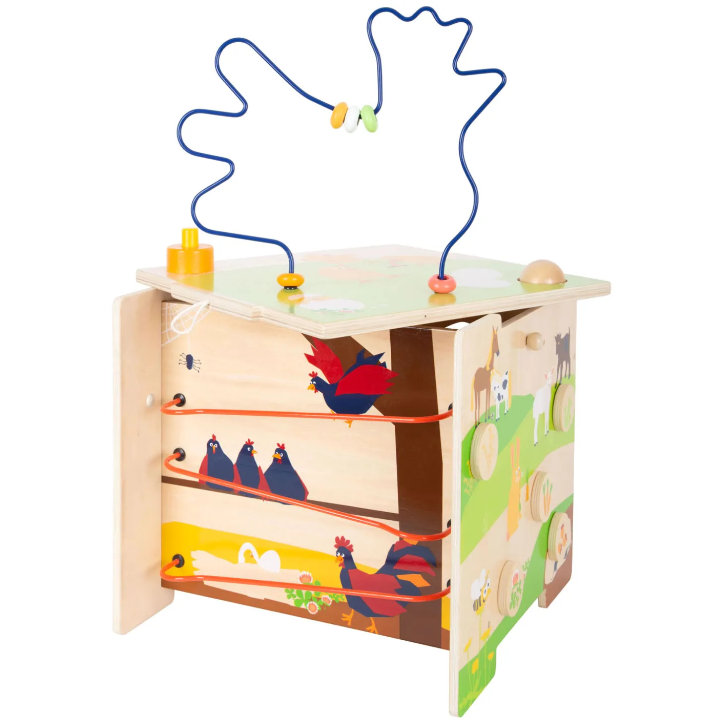 Wie eet wat? Met het vormaanpassingsspel moeten kinderen de afgebeelde dieren sorteren op hun juiste voedsel, en met het kralendoolhof leren ze hoe de bij, het konijn en de kuikens bewegen terwijl ze de kralen voortduwen. Zo traint de motoriekkubus niet alleen de herkenning van kleuren en vormen, maar geeft tegelijkertijd ook basiskennis over dieren op de boerderij. Het is een uniek motorisch speelgoed met een hoge speelwaarde als de nieuwe favoriet in de kinderkamer! De kloppende knikkerbaan zorgt voor extra speelplezier en de knikker belandt in het kippennest!