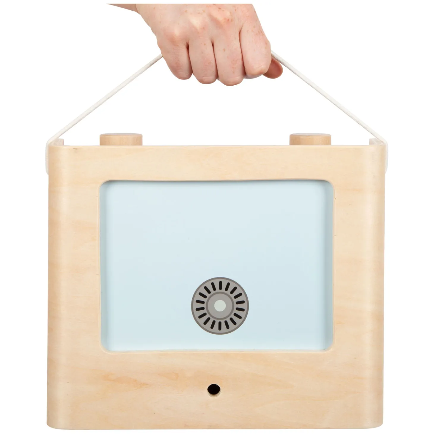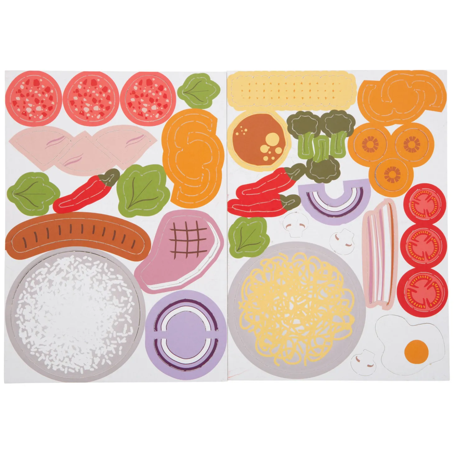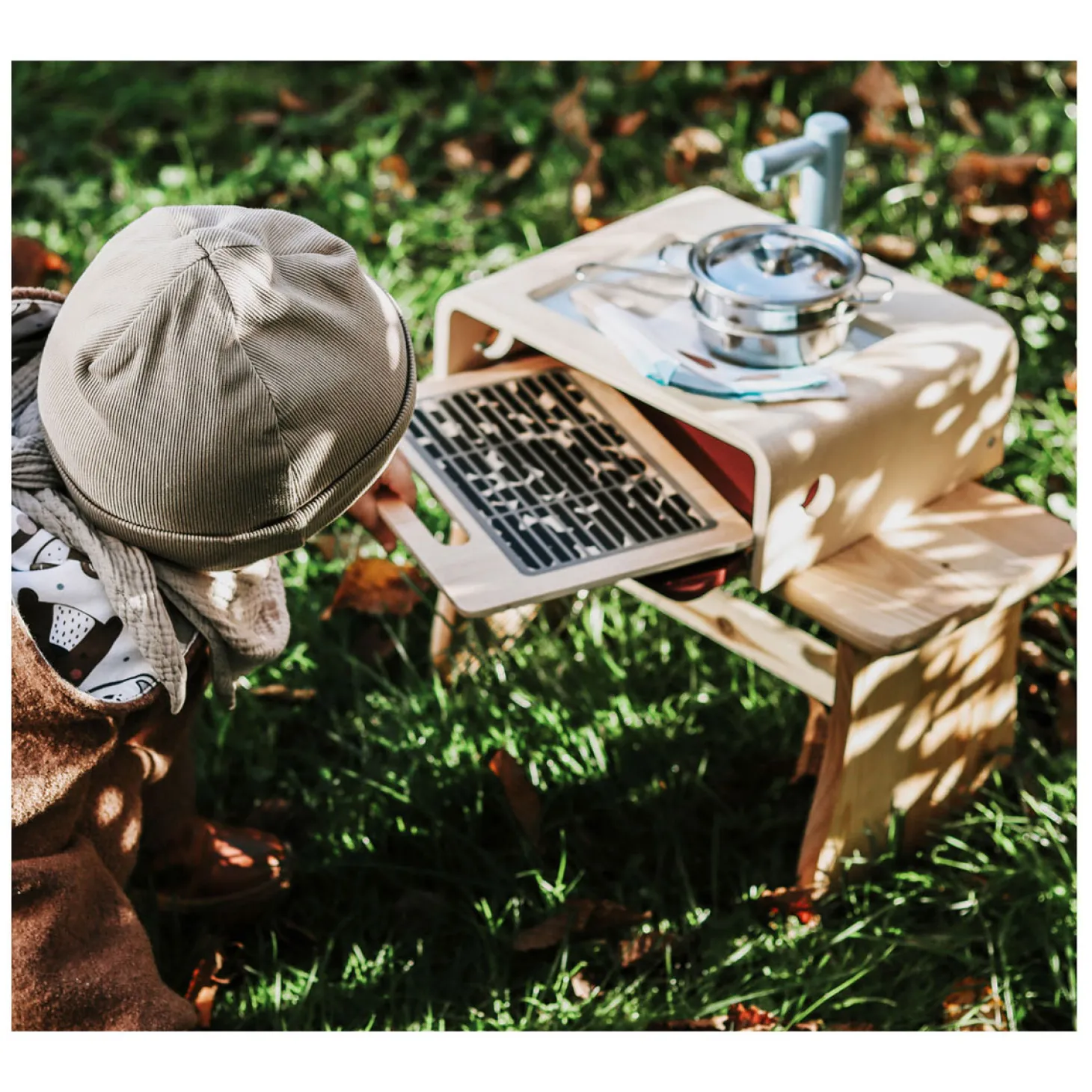 De 2 kartonnen vellen bevatten voedsel/ingrediënten die eruit kunnen worden gehaald en kunnen worden bereid, wat de basis vormt voor diverse speelideeën. Wordt geleverd met een theedoek, pan, pot met deksel, grilltang en spatel van hout en een dubbelzijdige bakplaat voor het bakken van pizza of grillen. De gasvlam print aan de onderzijde imiteert een echte grill. De voorkant van de keuken heeft draaiknoppen net als op een echt kampeerfornuis. Nadat het koken is gedaan, verandert deze kleine keuken in een wastafel door hem om te draaien en de kraan erin te doen. En dat is bijzonder praktisch: alle accessoires en onderdelen passen in de keukenkoffer en zijn onderweg veilig opgeborgen.
