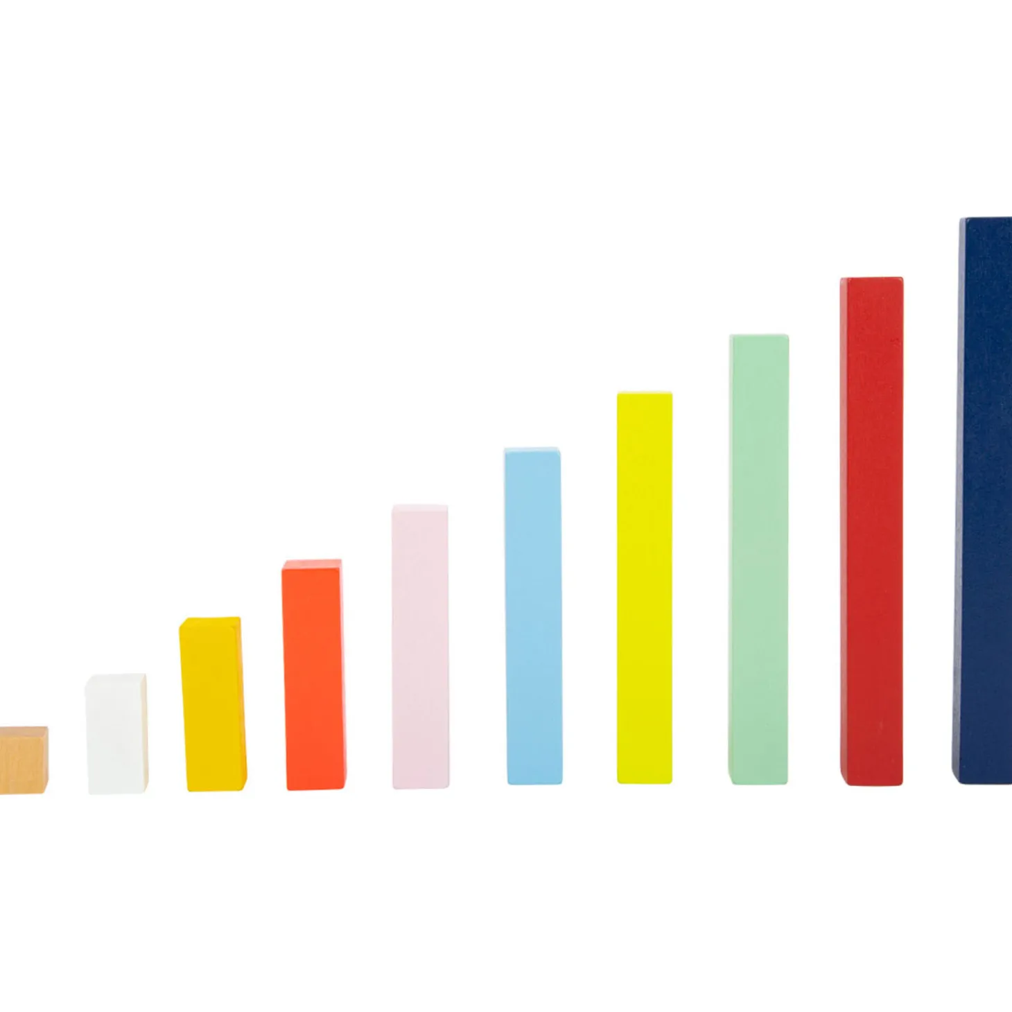 Gebruik de staven bijvoorbeeld bij het leren van breuken. Als voorbeeld kun je 1/10 uitleggen met de langste staaf en de 10 kleinste blokjes. Als je de 10 kleinste blokjes opstapelt, heeft dit dezelfde lengte als de donkerblauwe staaf. Haal steeds een blokje weg en vertel de eerste paar keer zelf waar het aan gelijk staat: “Dit is 9/10, dit 8/10,…”. Vraag daarna aan de kinderen wat de breuk nu is als je nog een blokje weghaalt. Maak het steeds een stapje moeilijker door verschillende breuken weer te geven.