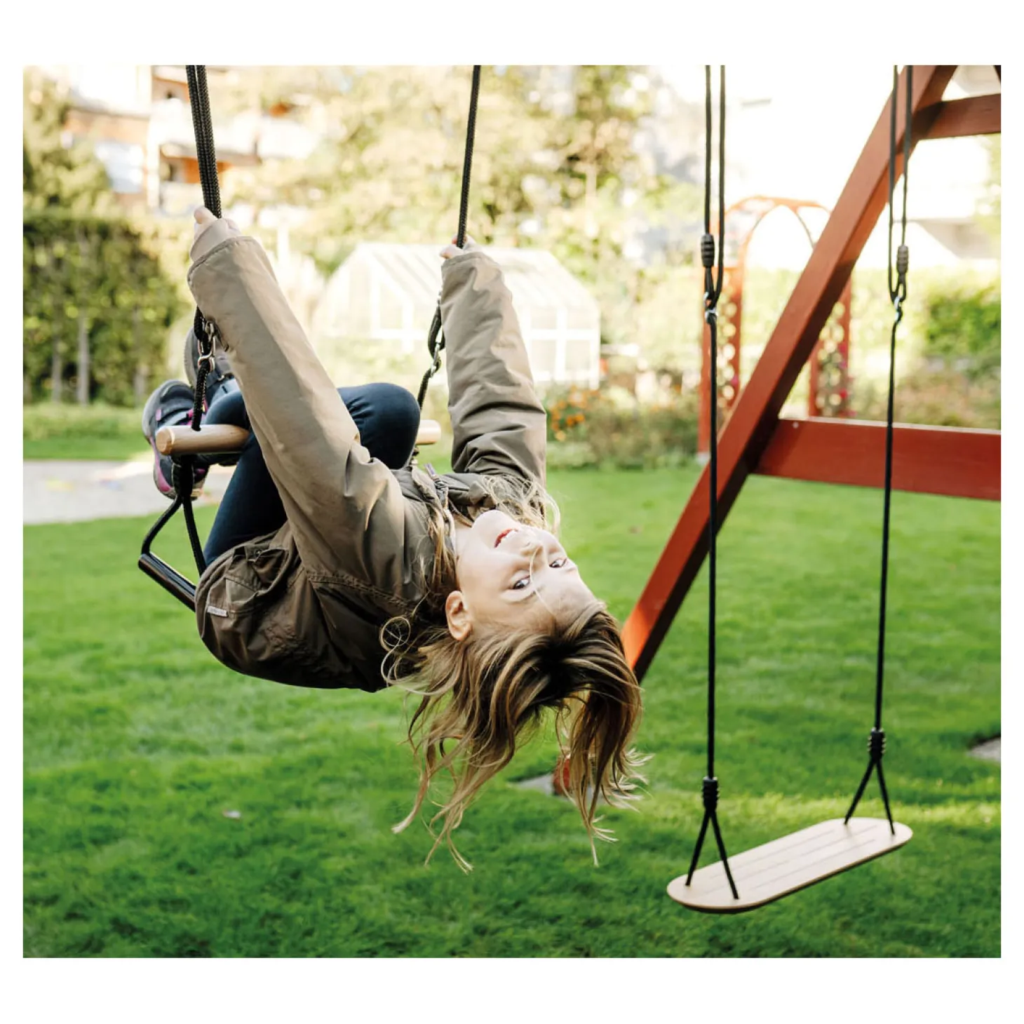 •De houten trapezestang kan gebruikt worden als zitplaats bij het schommelen of gymnastiek